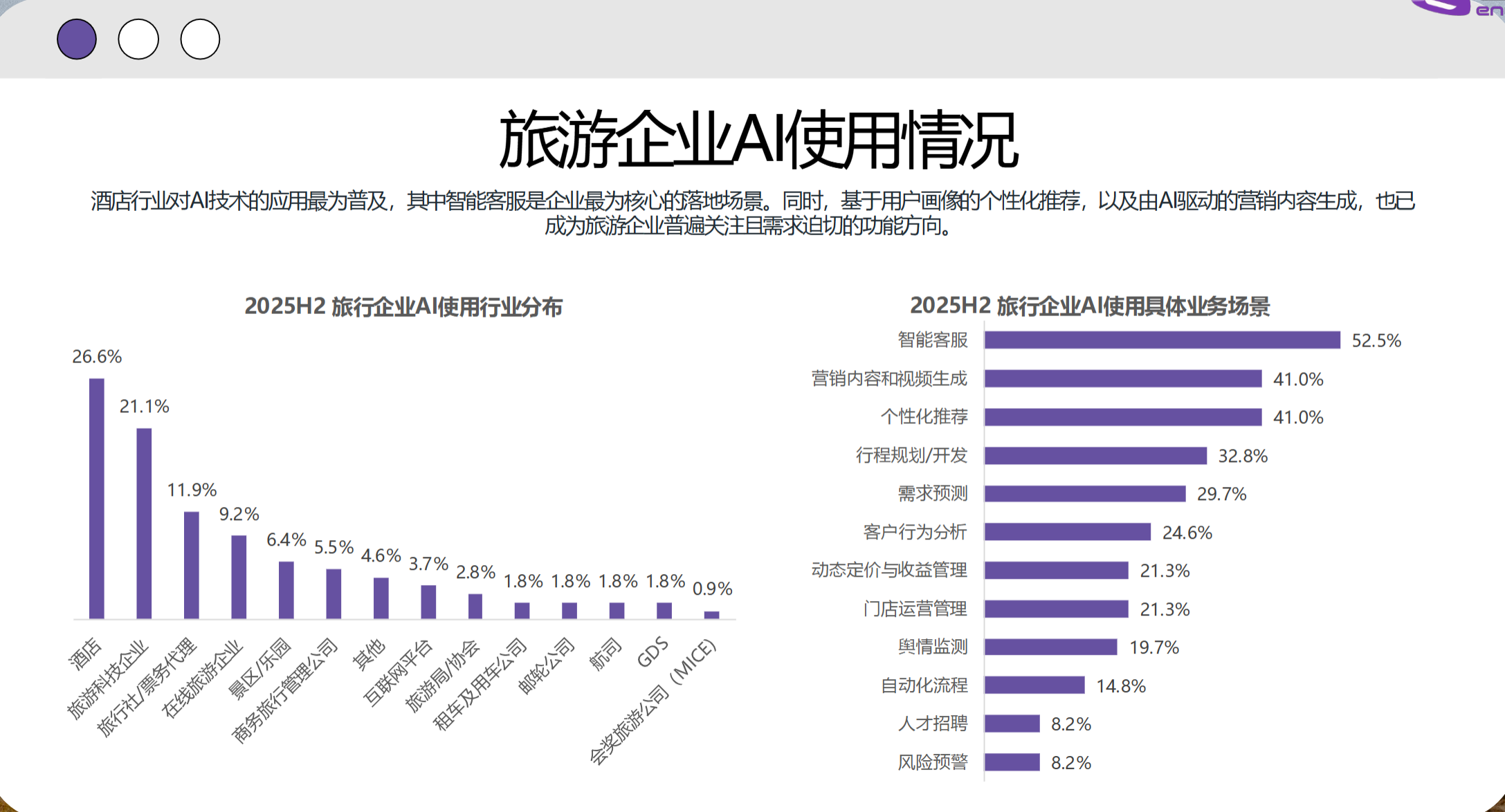 而企业端,“2025H2旅行企业AI使用具体业务场景”图表(PART02)显示,酒店行业应用最普及,智能客服以52.5%的占比成为核心场景,营销内容生成和个性化推荐均达41.0%。像华住会的7x24小时智能管家、首旅如家的“AI数字店长”,已经实现降本增效与增收双赢。
