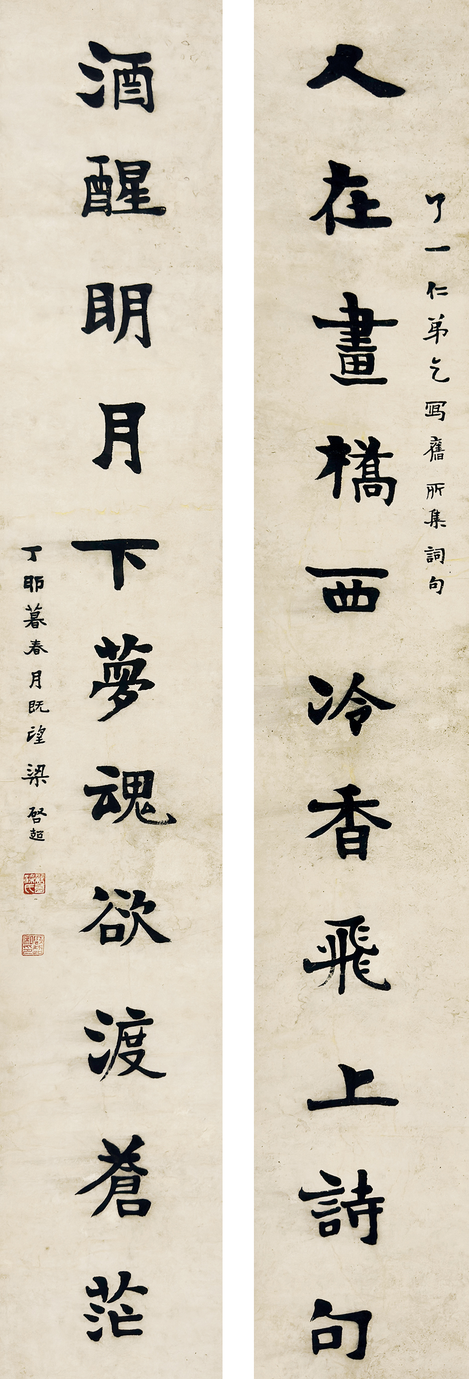 集句自宋代。上联“人在画桥西”自俞桂《春归》,“冷香飞上诗句”自姜夔《念奴娇》;下联“酒醒明月下”自姜夔《玲珑四犯》,“梦魂欲渡苍茫”自周密《高阳台》。上款“了一仁弟乞写旧所集词句”。王力,语言学家、教育家,中国现代语言学奠基人之一,曾为清华国学研究院第二届学生,为梁启超爱徒。同款作品,2021年王力先生的子女王缉志、王缉慈,将梁启超于1927年赠予王力的楷书对联捐赠给清华大学。