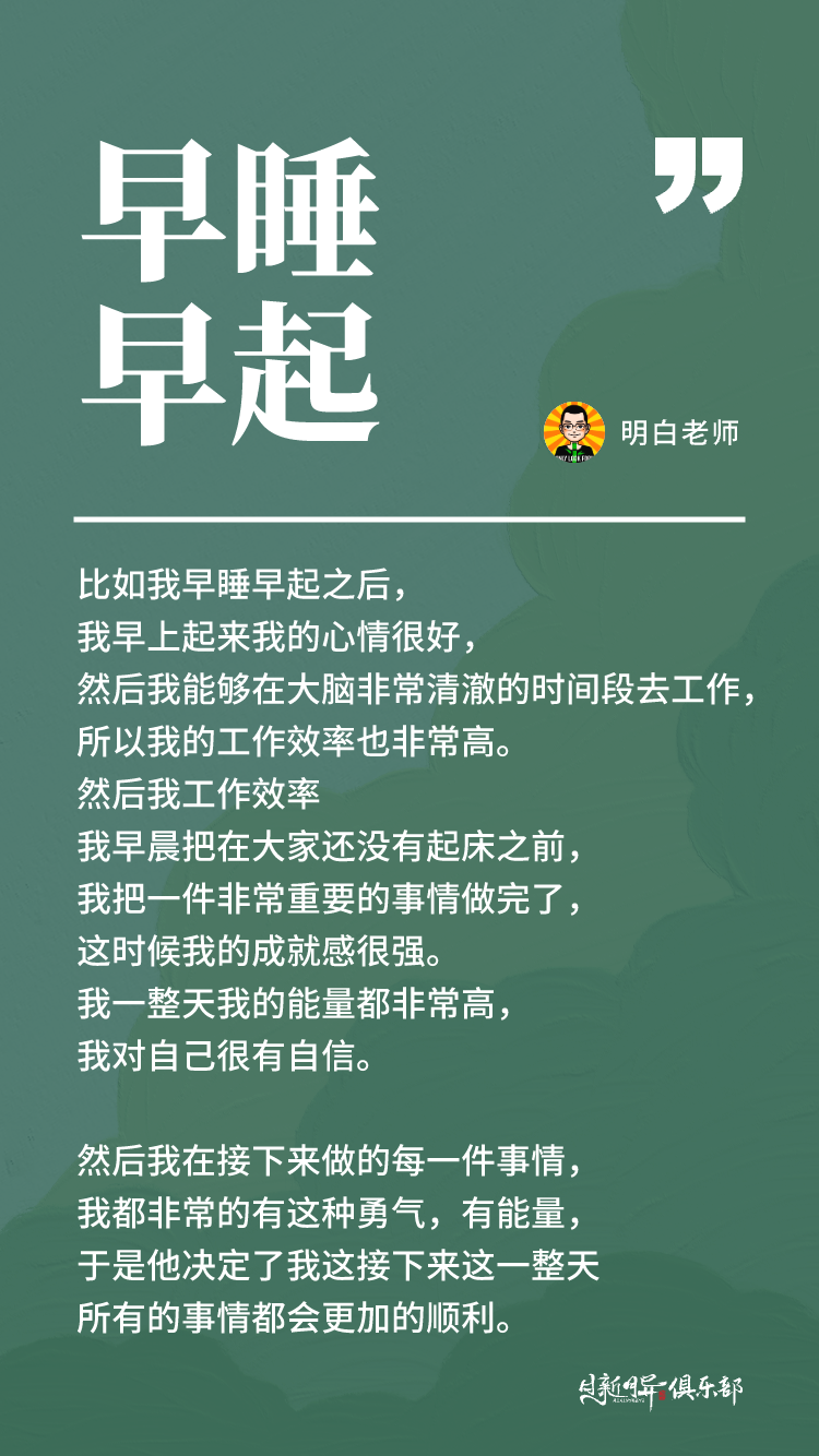 比如我早睡早起之后,我早上起来我的心情很好,然后我能够在大脑非常清澈的时间段去工作,所以我的工作效率也非常高。然后我工作效率我早晨把在大家还没有起床之前,我把一件非常重要的事情做完了,这时候我的成就感很强。我一整天我的能量都非常高,我对自己很有自信。