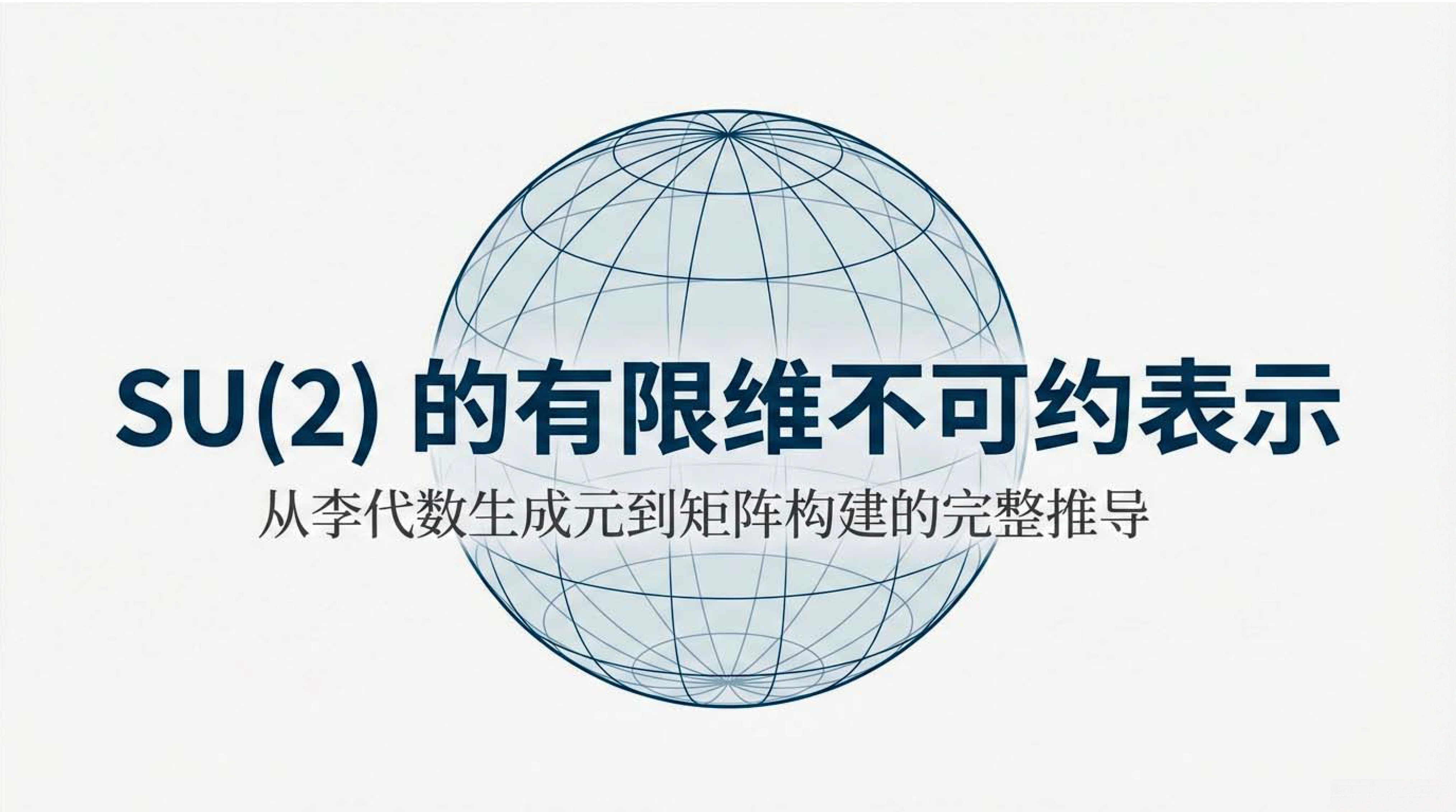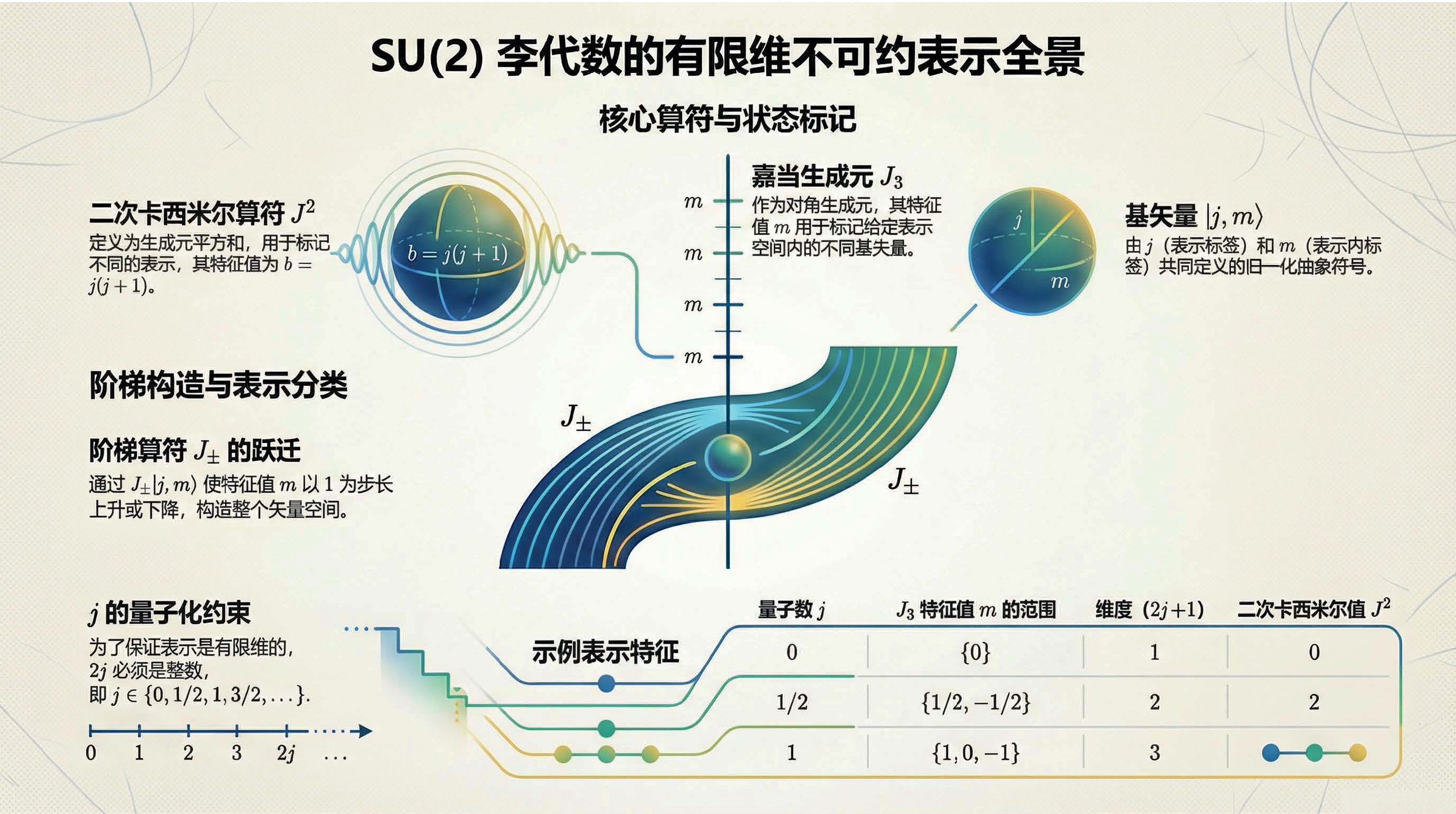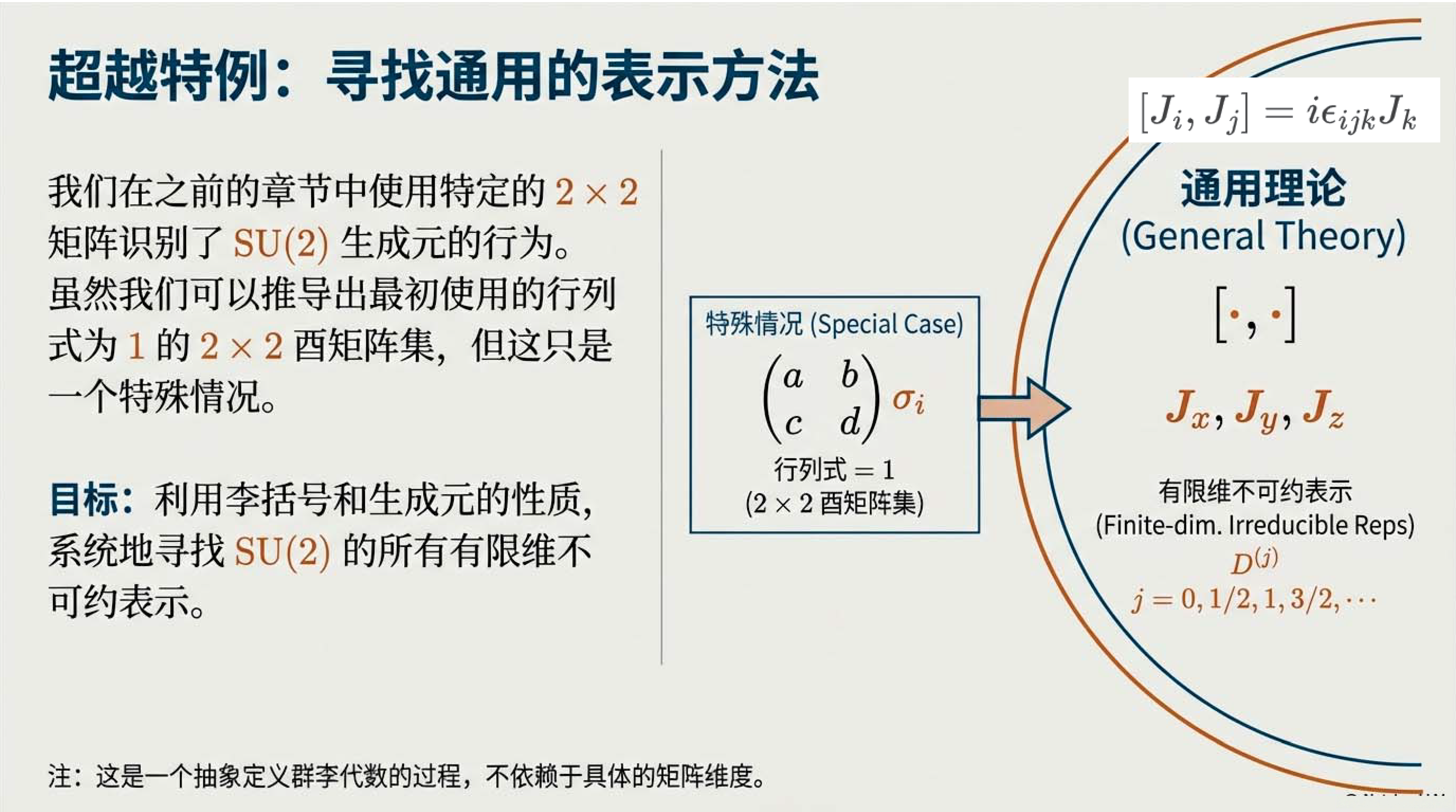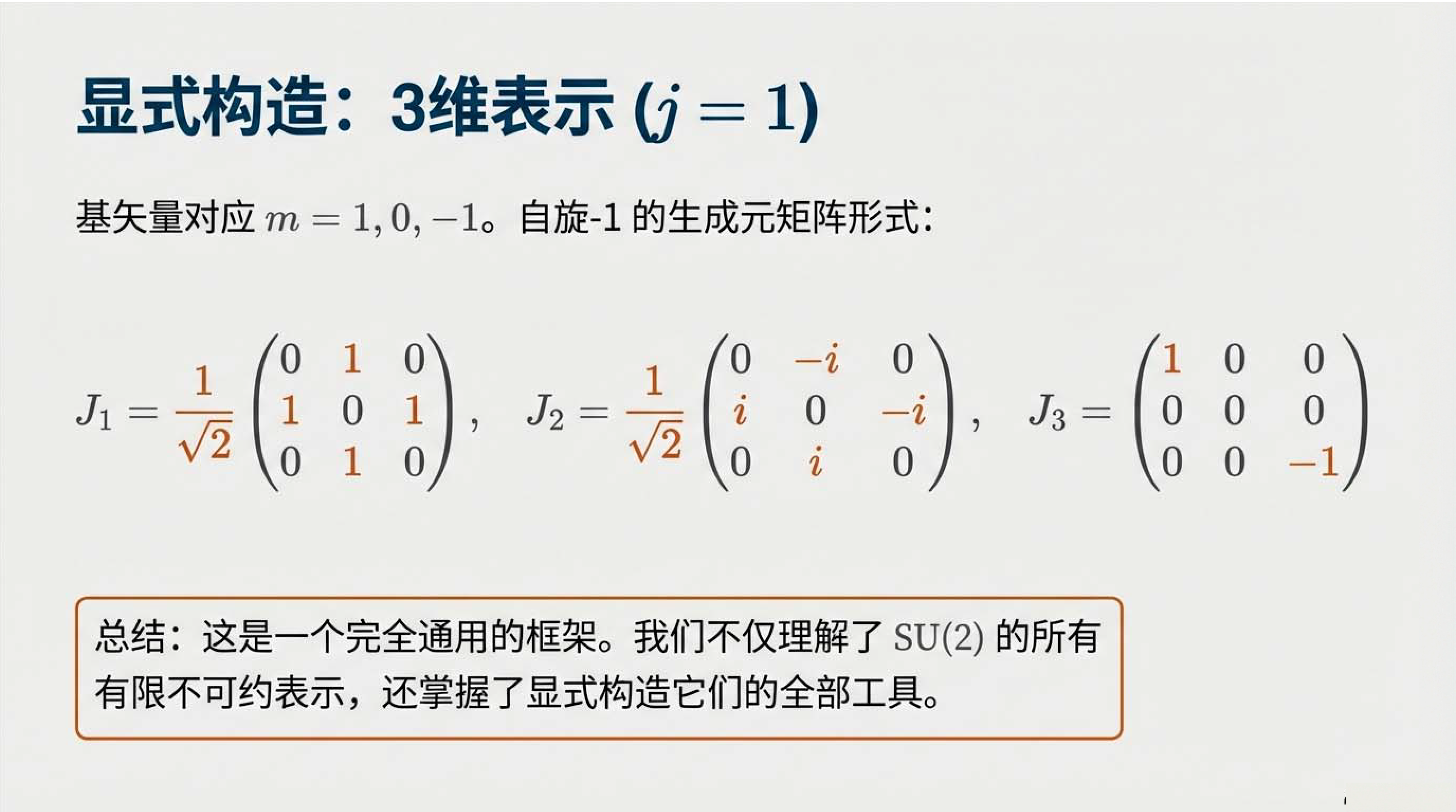 第9课视频的主要内容:详解了 SU(2) 的有限维不可约表示。利用卡西米尔算符 J^2 标记不同表示,通过对角化的嘉当生成元 J_3 为态提供标签。借助阶梯算符证明了特征值 m 的等间距分布,确定了 j 的量子化取值,并给出了 2 维及 3 维表示的具体矩阵形式。