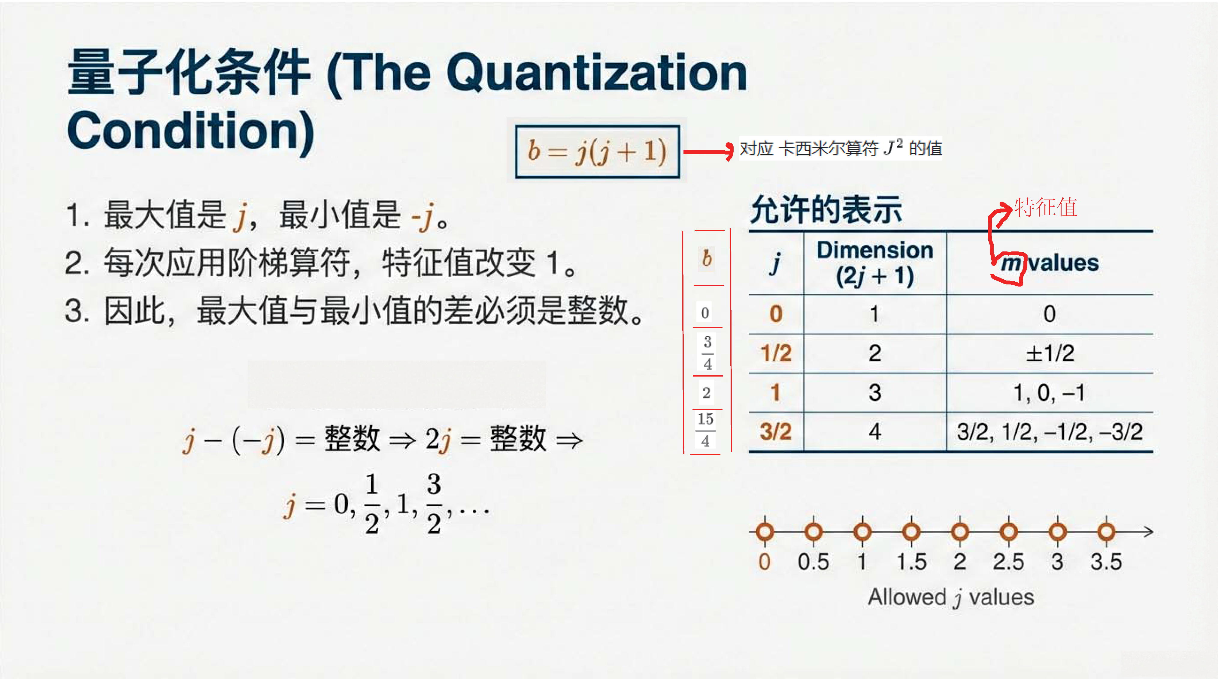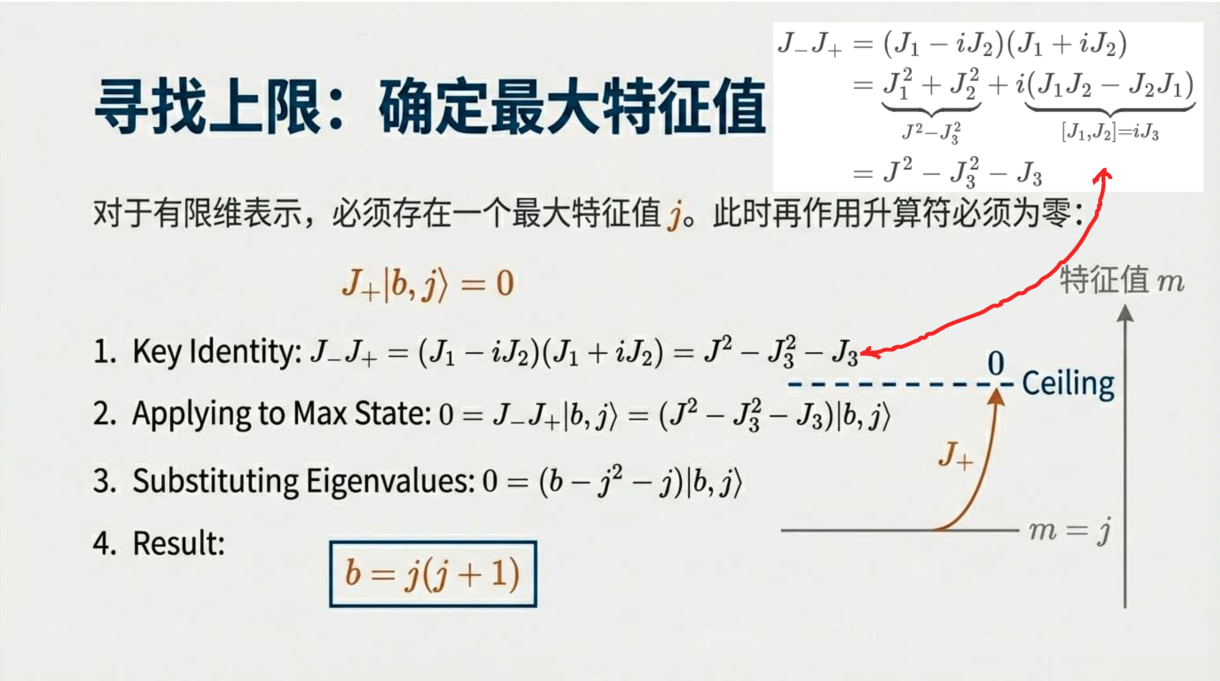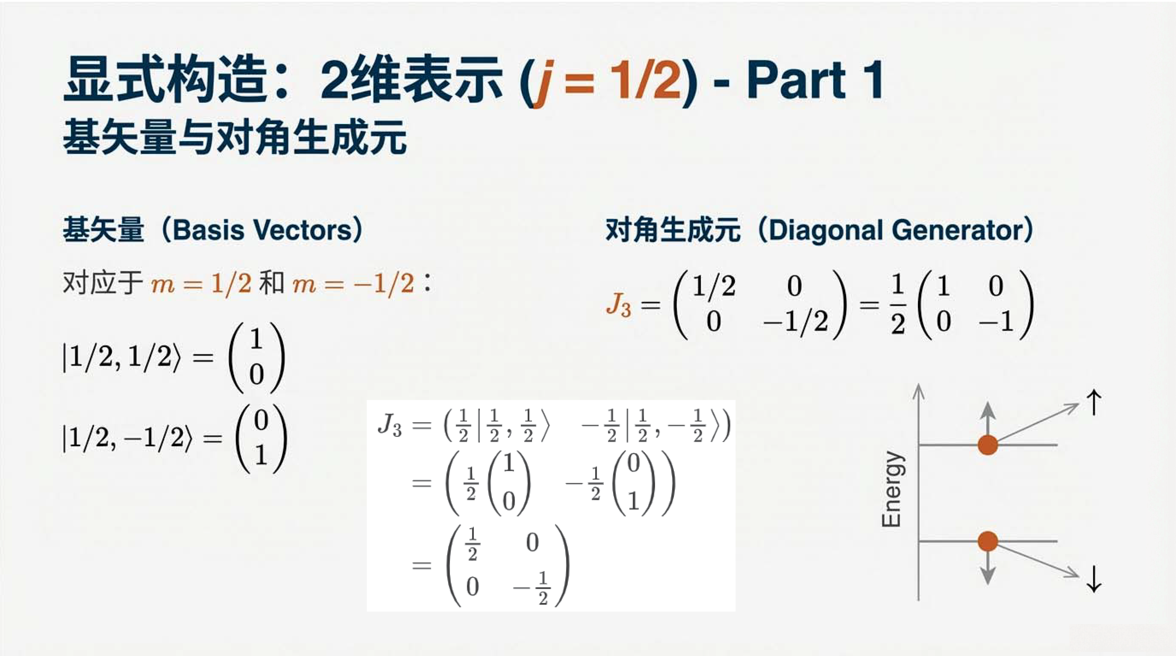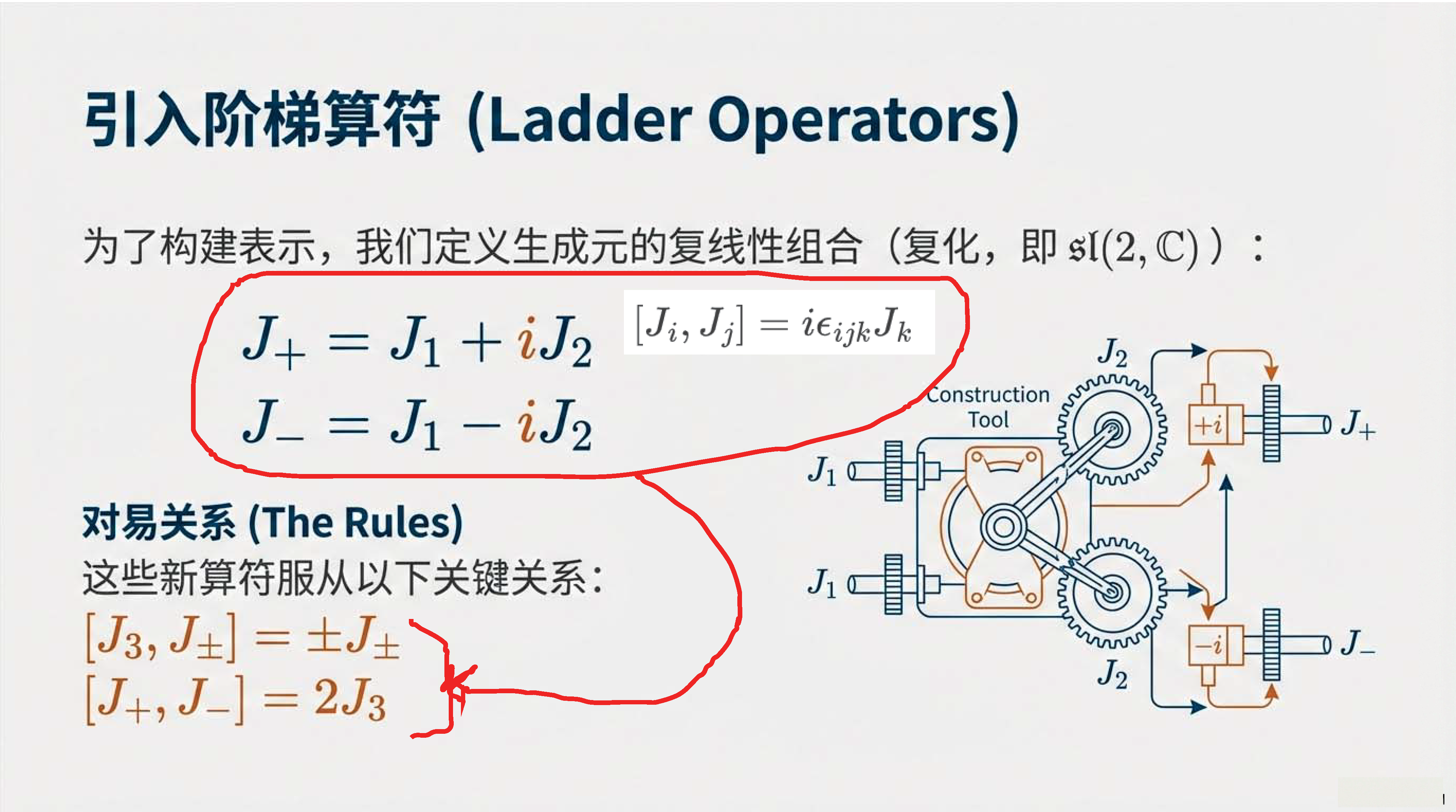 第9课视频的主要内容:详解了 SU(2) 的有限维不可约表示。利用卡西米尔算符 J^2 标记不同表示,通过对角化的嘉当生成元 J_3 为态提供标签。借助阶梯算符证明了特征值 m 的等间距分布,确定了 j 的量子化取值,并给出了 2 维及 3 维表示的具体矩阵形式。