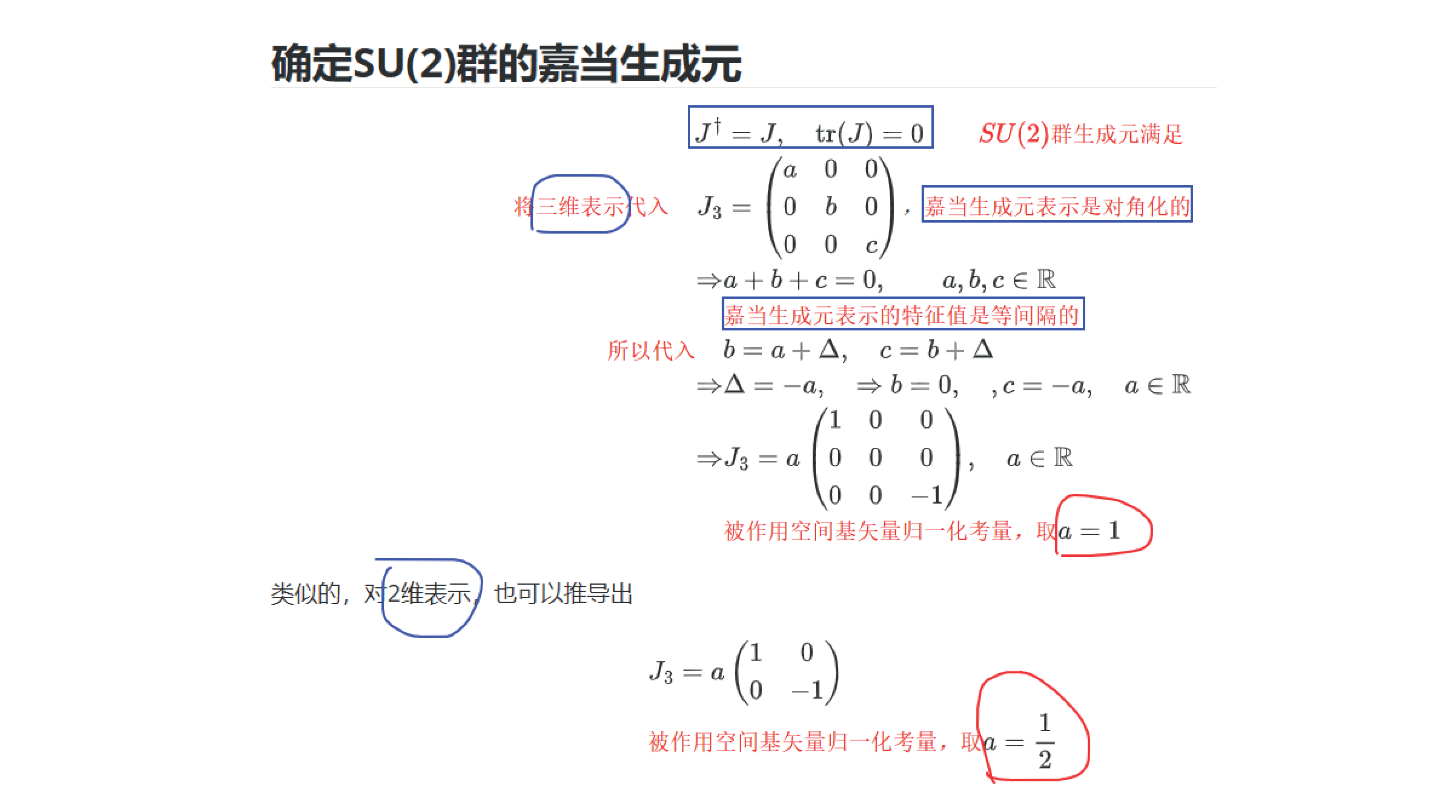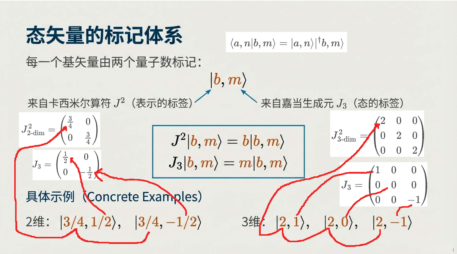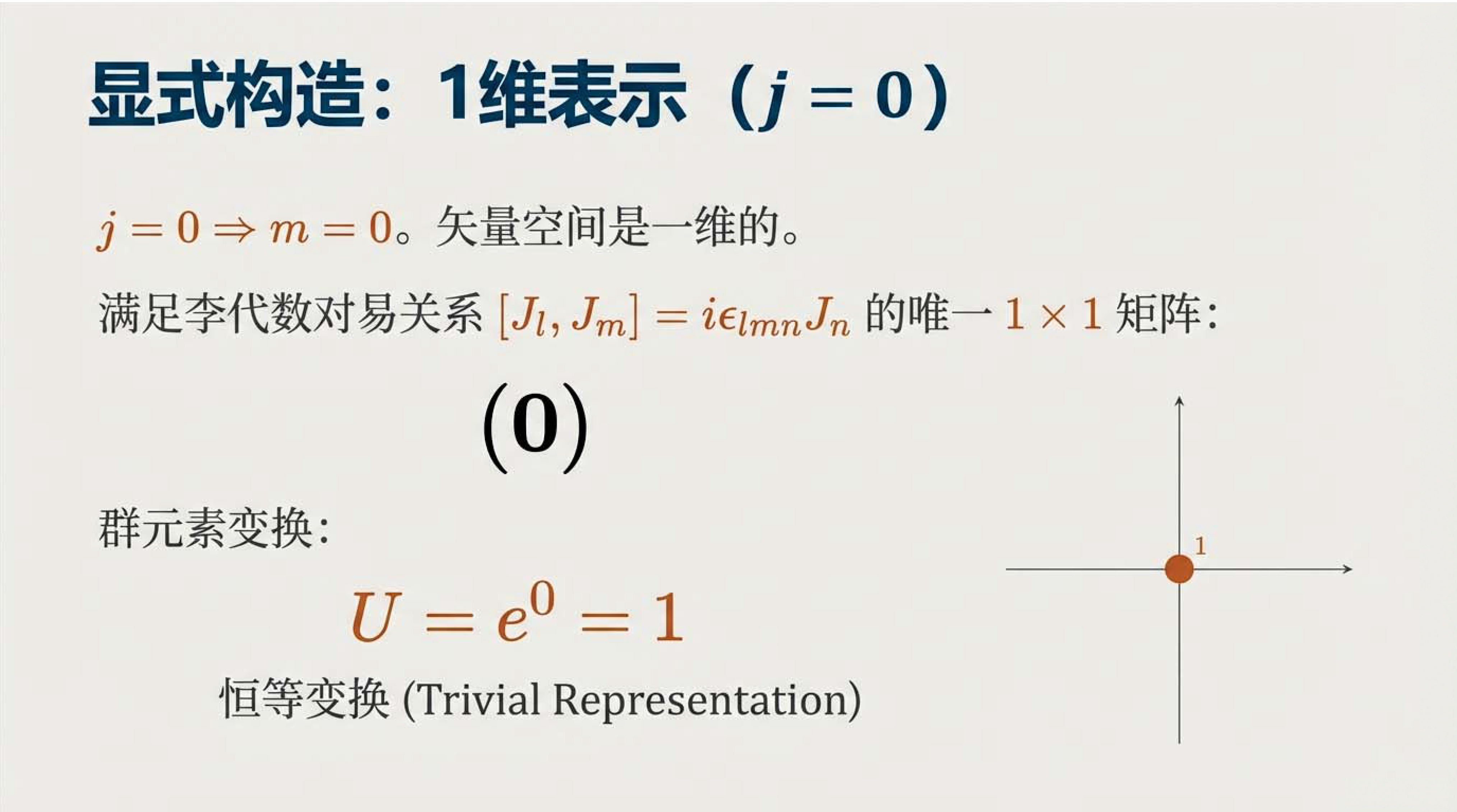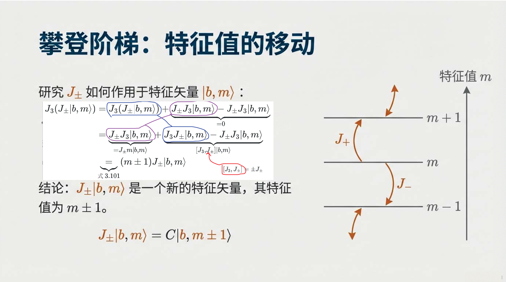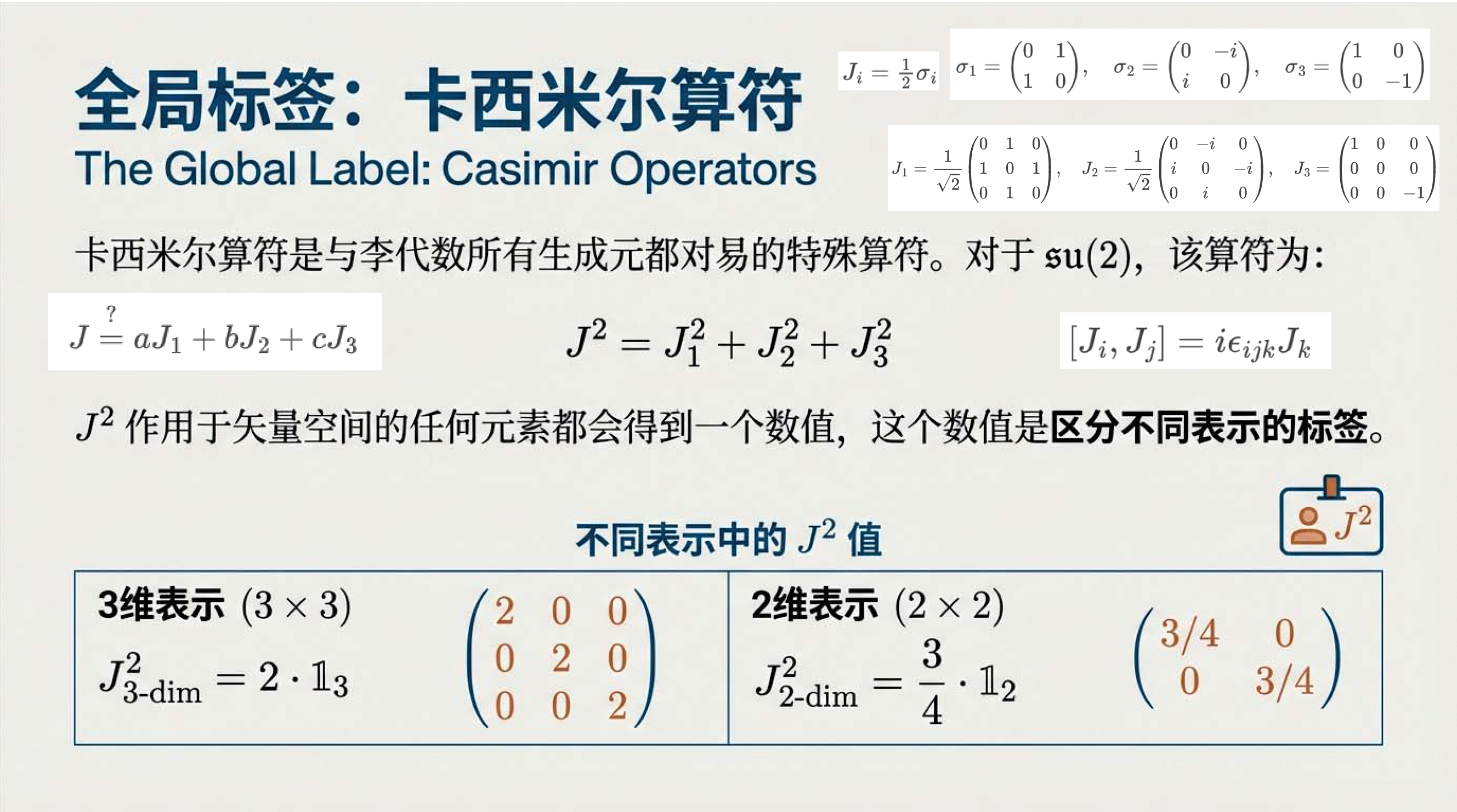 第9课视频的主要内容:详解了 SU(2) 的有限维不可约表示。利用卡西米尔算符 J^2 标记不同表示,通过对角化的嘉当生成元 J_3 为态提供标签。借助阶梯算符证明了特征值 m 的等间距分布,确定了 j 的量子化取值,并给出了 2 维及 3 维表示的具体矩阵形式。