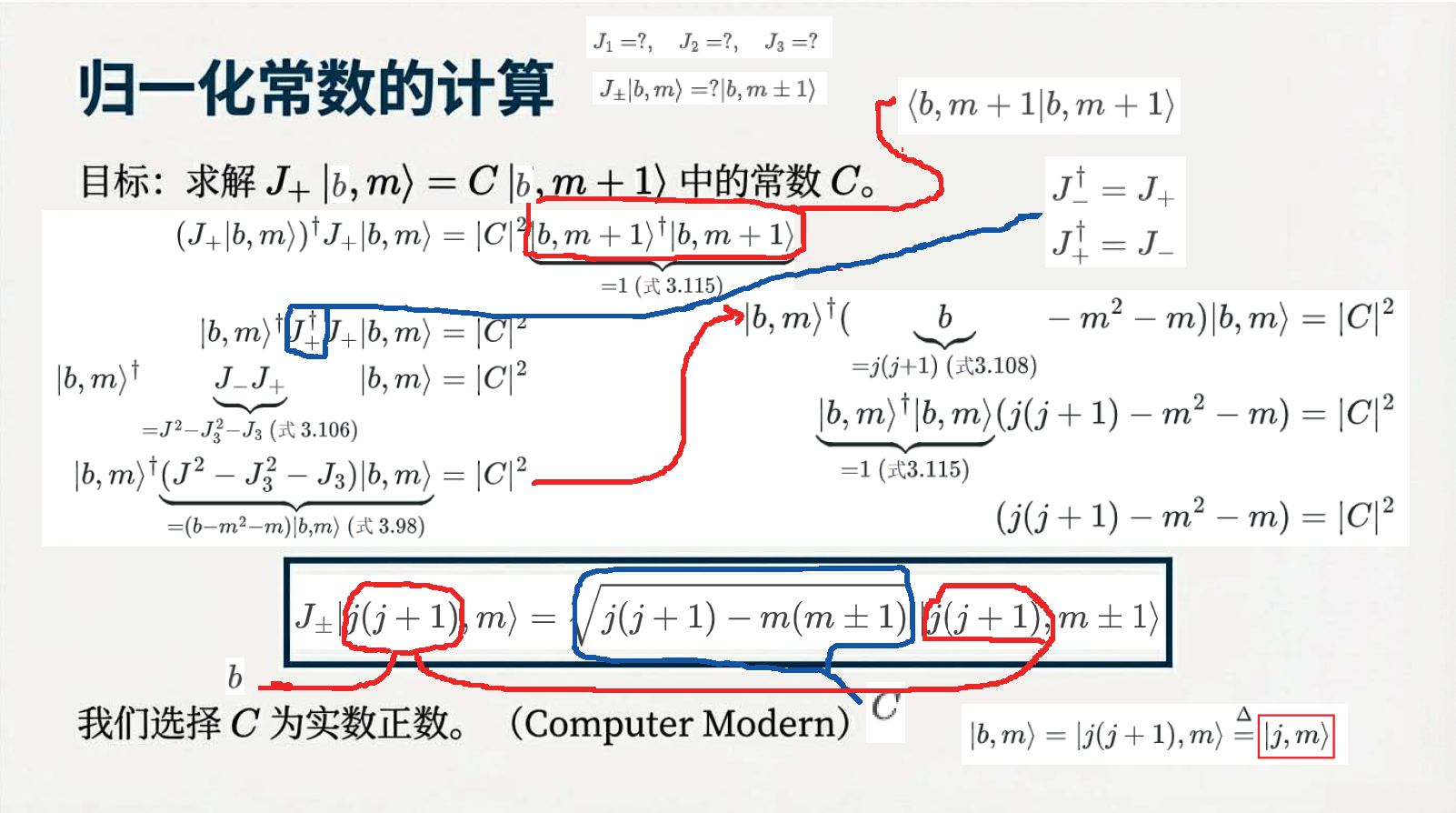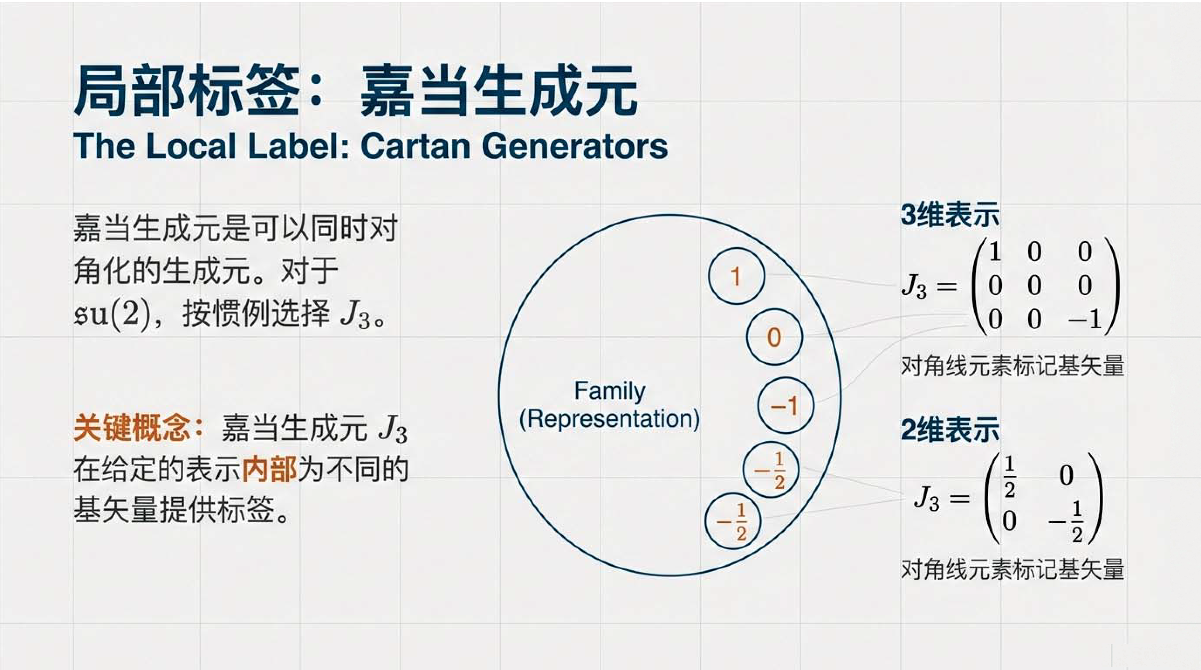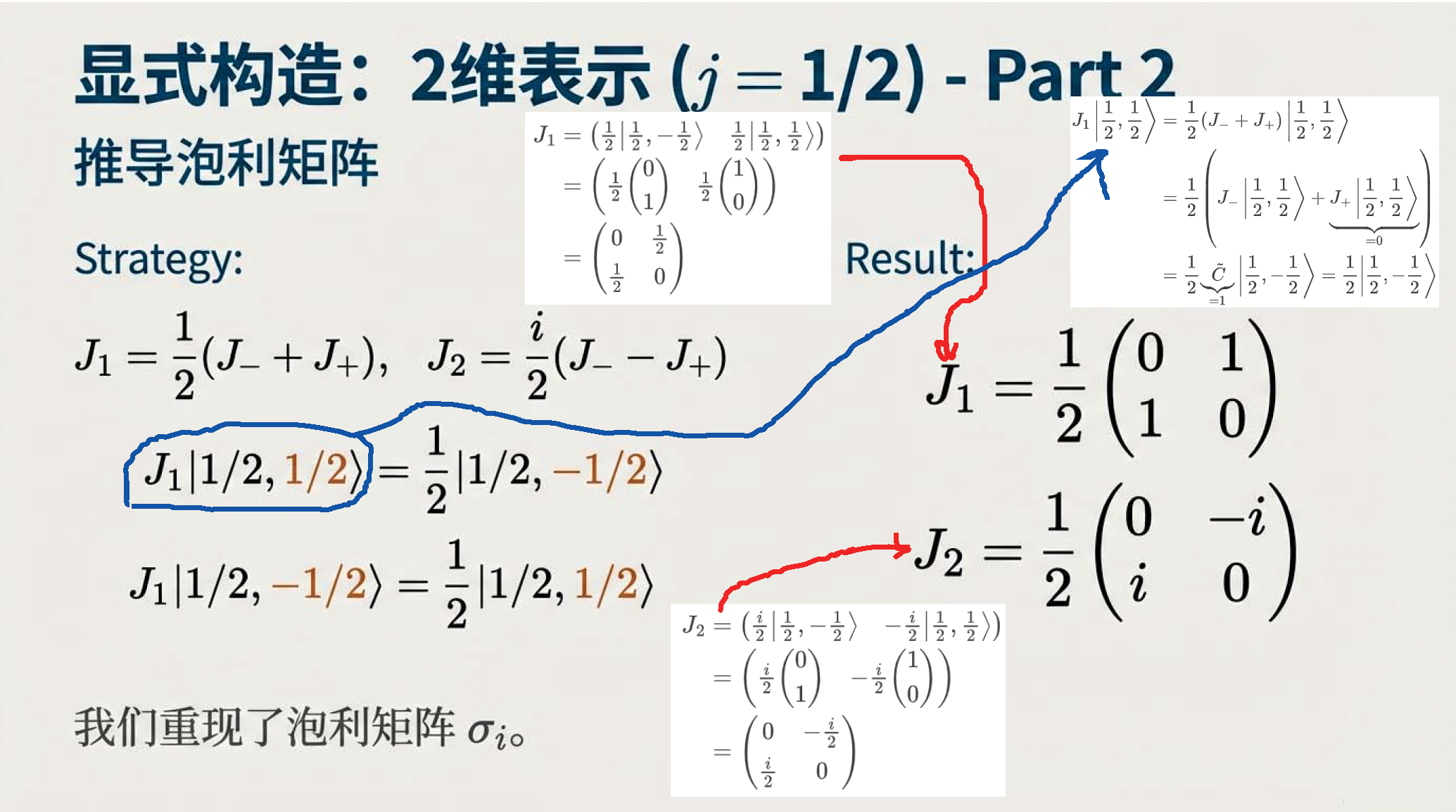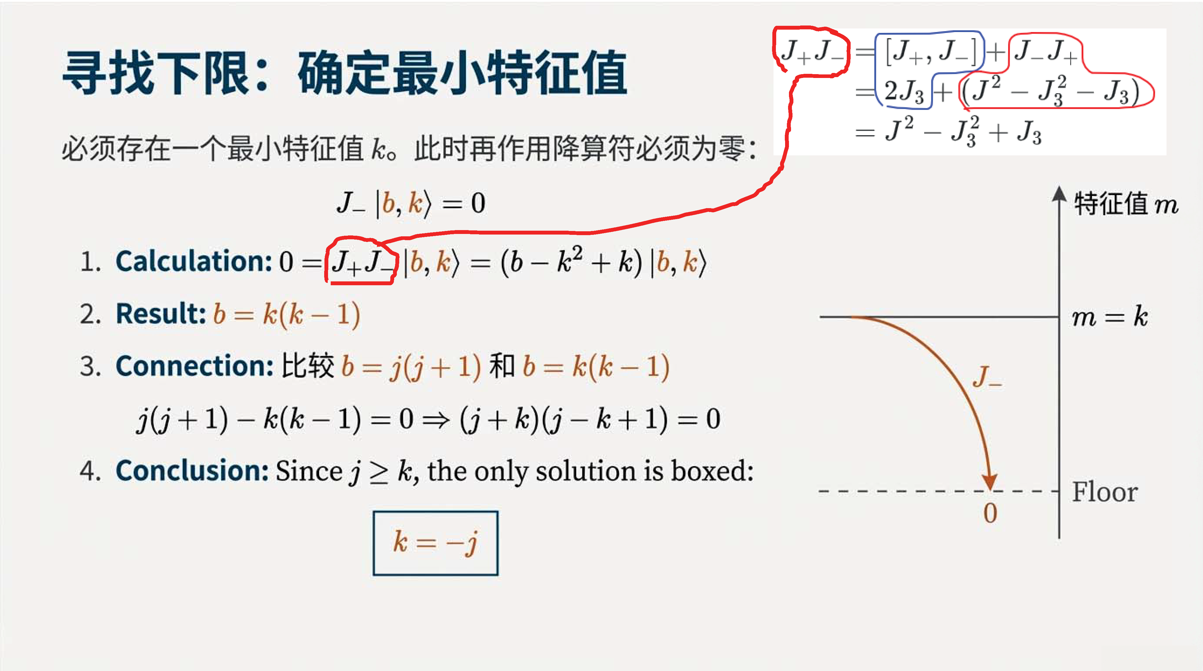第9课视频的主要内容:详解了 SU(2) 的有限维不可约表示。利用卡西米尔算符 J^2 标记不同表示,通过对角化的嘉当生成元 J_3 为态提供标签。借助阶梯算符证明了特征值 m 的等间距分布,确定了 j 的量子化取值,并给出了 2 维及 3 维表示的具体矩阵形式。