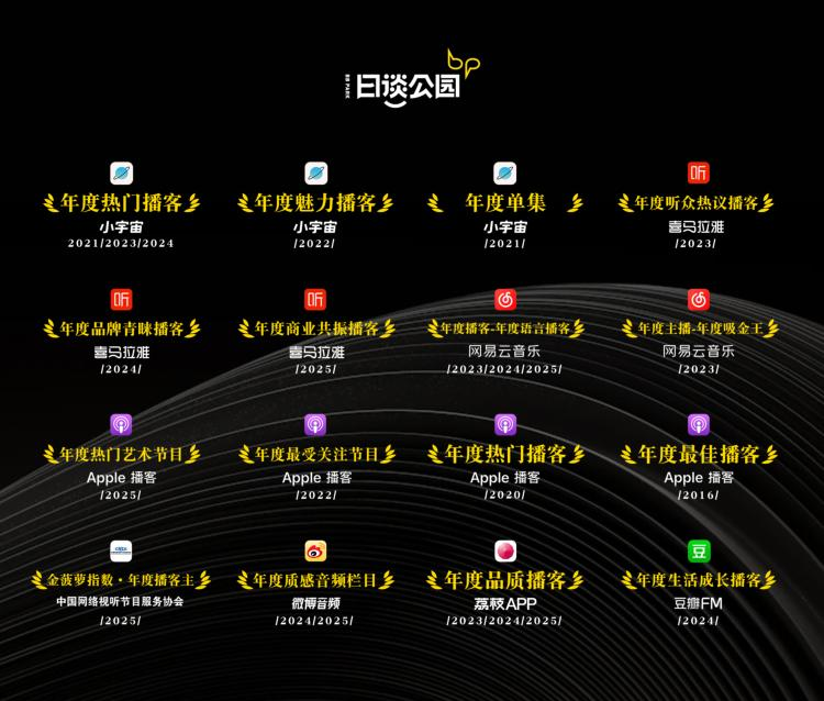 日谈公园,曾获小宇宙年度热门播客、喜马拉雅品牌青睐播客、Apple播客年度最佳播客、网易云音乐年度语言播客、荔枝APP年度品质播客等多项殊荣,并发起“日光派对”播客MCN,提供播客经济相关服务。这些年,我们曾获得过以下这些荣誉,感谢各个平台一直以来的厚爱与支持。