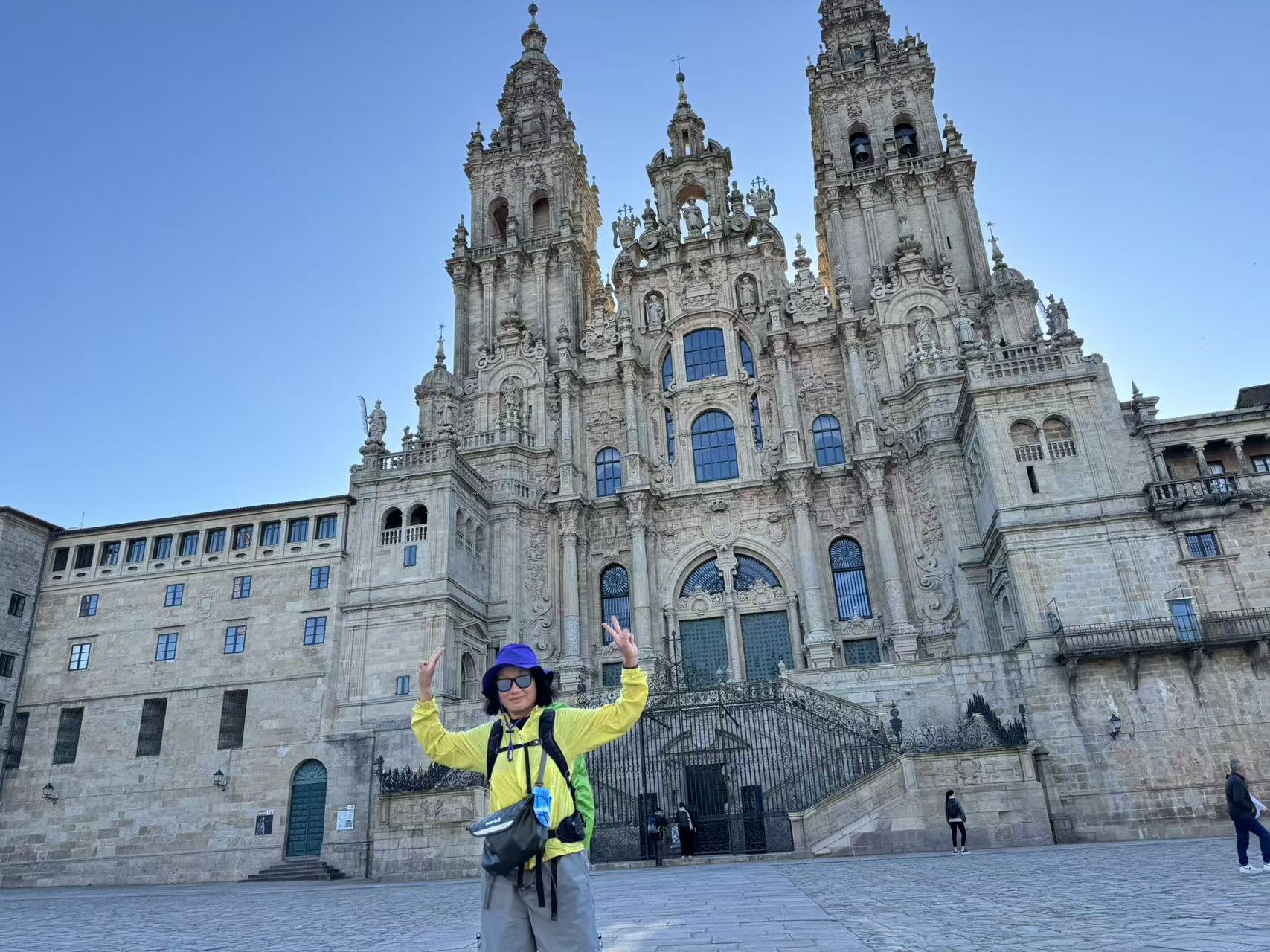 这位姐徒步西班牙朝圣之路(Camino de Santiago)。摄于终点圣地亚哥大教堂。