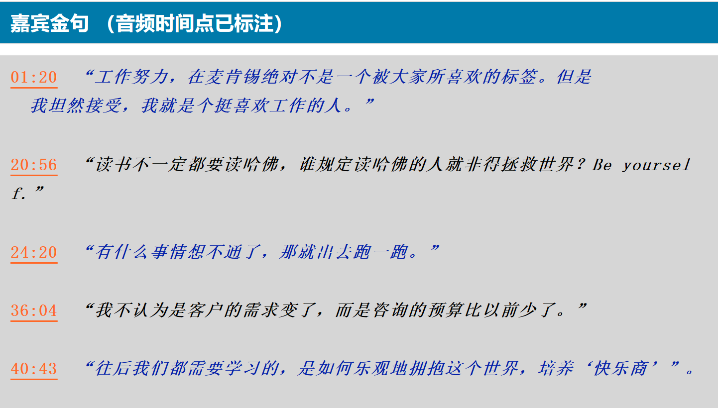 “说实话,看到这个反馈时,我挺震惊的,实在没法接受啊。了解我的朋友都知道,我特别热爱户外活动,喜欢徒步、跑步,热衷于逛吃逛喝。我原本不是工作狂,是因为麦肯锡的工作氛围,才让我变得hardworking。”当她说到这里,我俩在录音室里忍不住大笑起来。