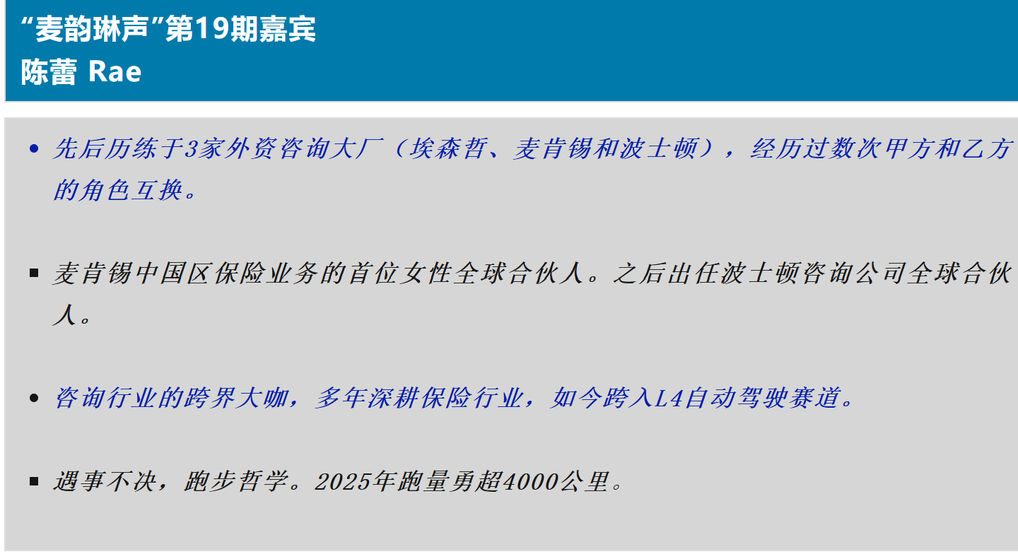 本期播客,我们从一个工作狂如何诚实面对自己聊起,一个多小时的对话坦诚又轻松。陈蕾在20多年的职业生涯中,先后历练于三家国际咨询公司,担任过两家顶级咨询公司的合伙人。此外,她有着丰富多元的甲方工作经验。最近,她加入了一家无人汽车创业公司。