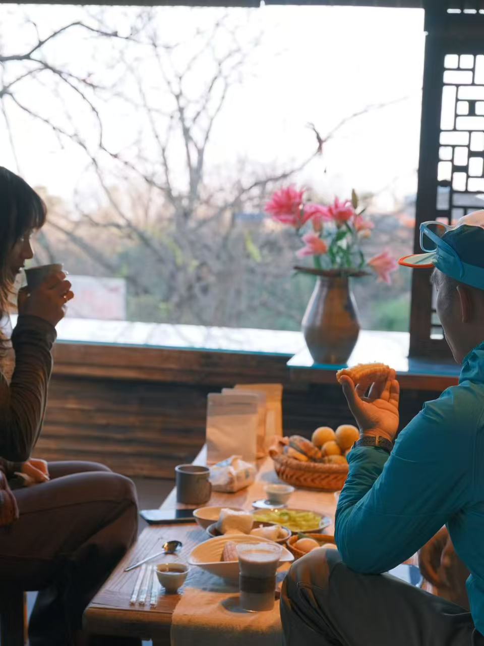 他们入住了朋友的民宿,享受了老板豆豆精心准备的美味早餐,并与热情的村民互动。