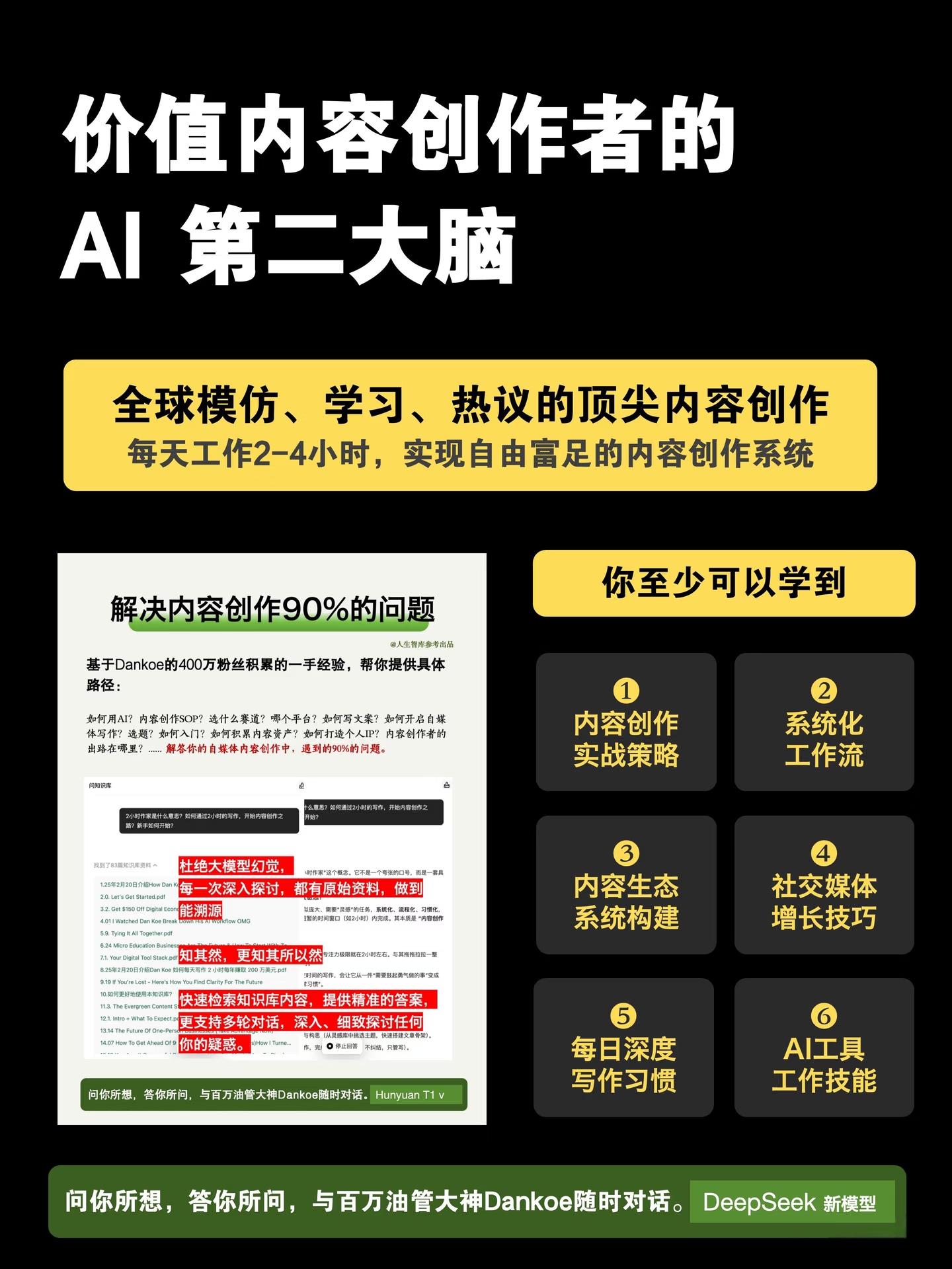我们耗时数月,系统化梳理了 Dan Koe 的全部博客、播客与内部课程,将其核心心法、实战策略与高频问答,构建为可随时对话的 AI 智能知识库。