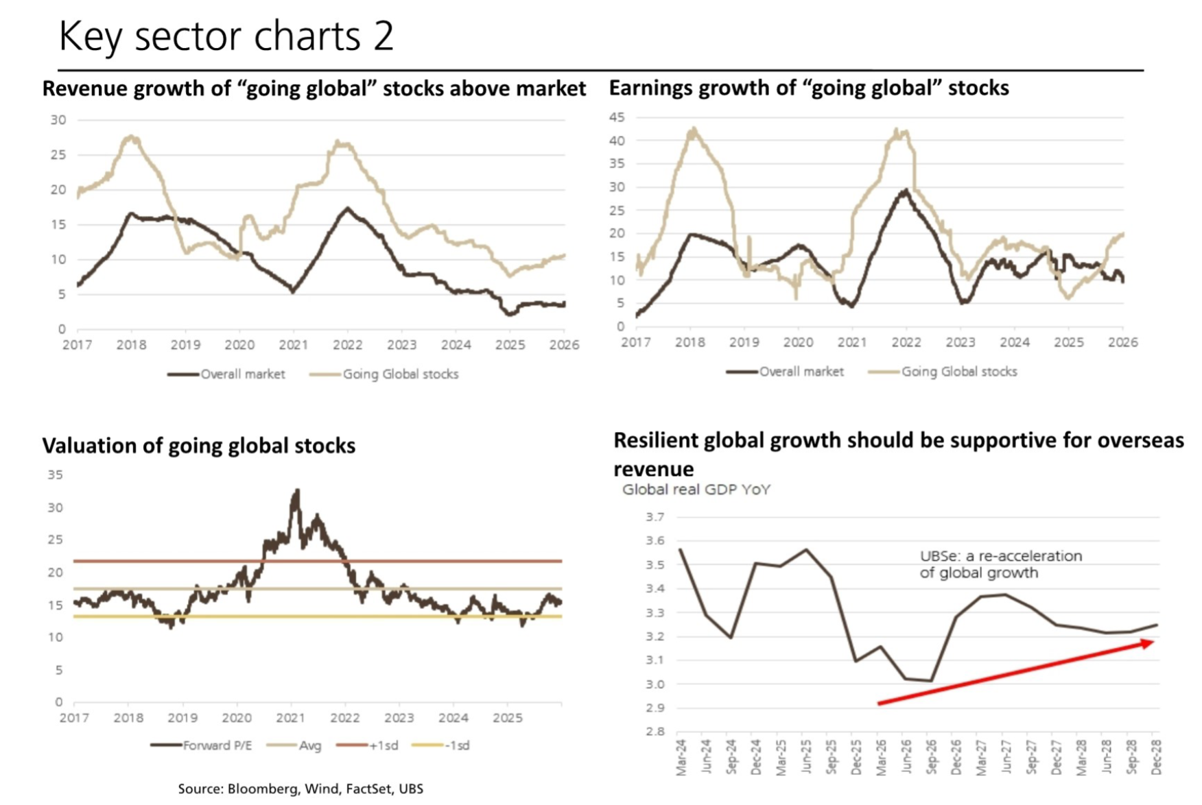 2026年上半年催化因素明确,“出海”与反内卷成为关键主线。UBS 16页的“‘出海’股营收增长图”显示,2017-2025年“出海”股营收增速持续高于整体市场,2026年有望延续这一态势,全球经济复苏将进一步支撑海外收入。反内卷政策成效初显,UBS 10页的“多晶硅价格走势图”显示,2024年5月以来价格稳步回升,快递ASP与机票价格同步复苏,PPI与企业营收高度相关,将推动企业利润修复。此外,UBS 8页的“保险资金股票及基金配置变化图”显示,保险资金对权益资产的配置比例逐步提升,成为市场重要支撑力量。