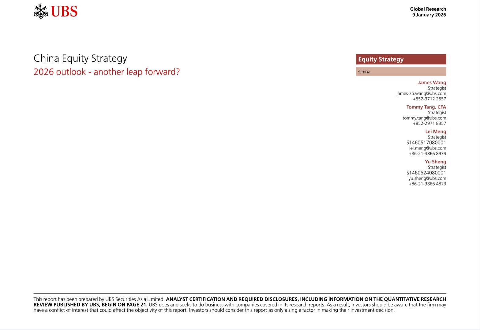 瑞银2026年1月发布的《中国股票策略展望》明确指出,尽管经济保持温和态势,但创新驱动与宽松政策形成双重支撑,股市将迎来正向开局,估值优势与资金流入进一步强化配置价值。