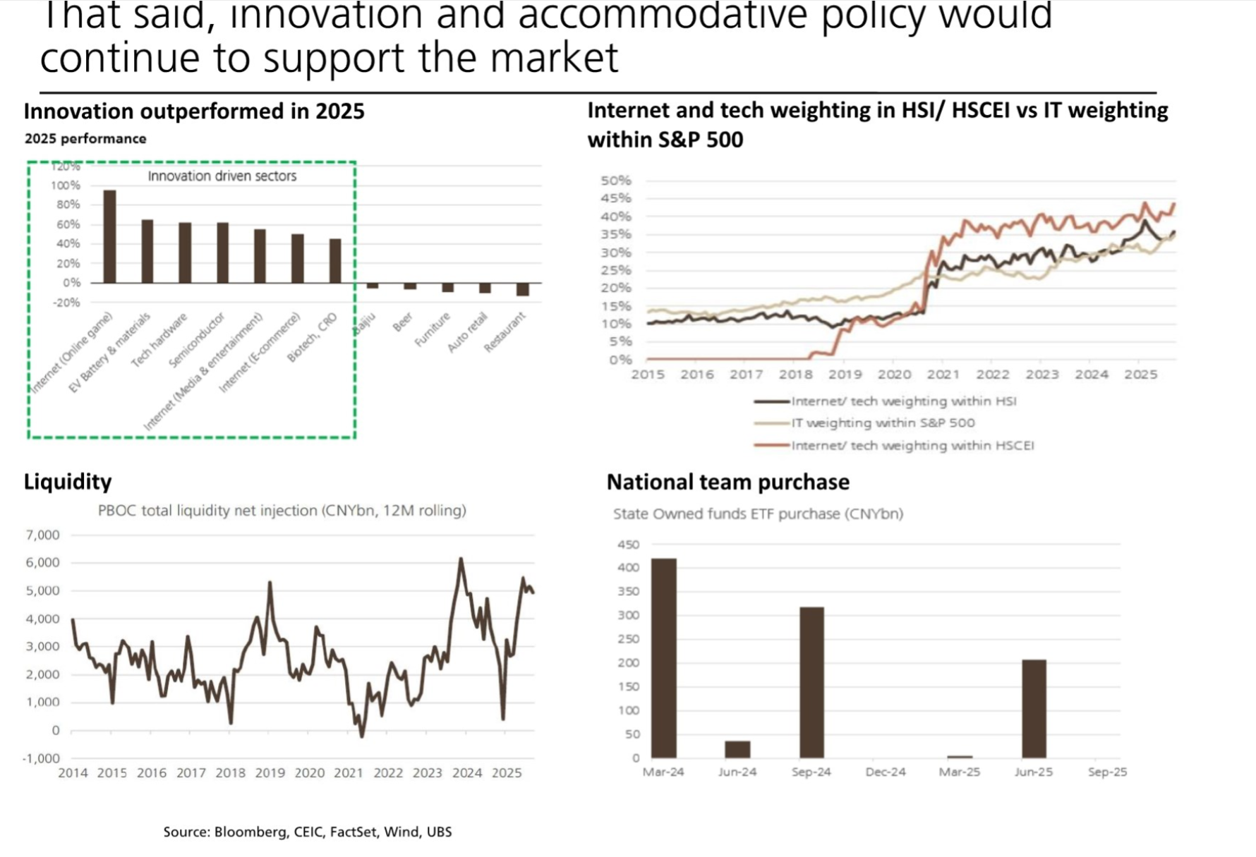 创新成为经济核心增长极,这一趋势在数据上体现得尤为明显。UBS 3页的“中国R&D支出占GDP比重图”显示,2025年中国该比重持续攀升,已逐步追赶美日德等发达经济体,预计2030年将进一步接近4%。同期“R&D支出PPP口径图”显示,中国研发投入规模已仅次于美国,成为创新的坚实基础。2025年创新板块表现突出,UBS 2页的“2025年创新驱动板块表现图”显示,相关板块全年涨幅远超市场平均,华为麒麟芯片手机发布、宁德时代新一代电池推出、小鹏新车亮相等案例,印证了科技硬件、新能源等领域的创新活力。