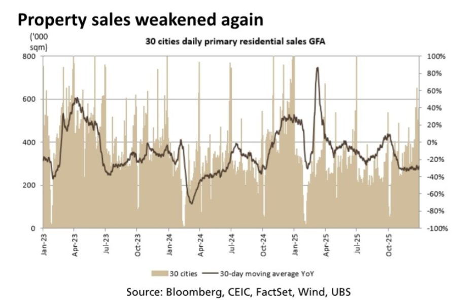 经济层面呈现“温和增长+结构分化”特征。房地产销售持续疲软,研报UBS 2页的“30城日均新房销售面积同比图”显示,2025年以来该数据持续处于负区间,最大跌幅接近-100%,30日移动平均同比增速长期低于零,反映地产行业压力仍在。消费端同样承压,UBS 2页的“中国零售销售同比增长图”显示,2022-2025年增速逐步下滑,补贴政策退坡后,增长动力明显减弱,部分时段甚至接近-15%。但信贷与汇率保持稳定,官方TSF信贷增长维持在7.4%-8.0%区间,年末USDCNY预期为7.00,为市场提供基础流动性。