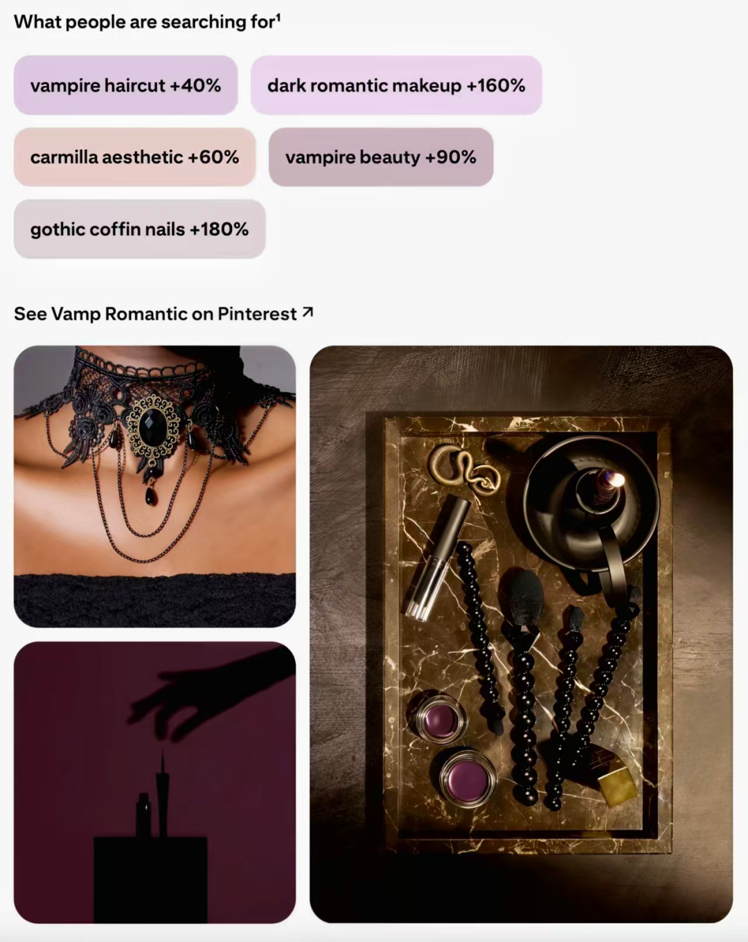 Pinterest表示:美丽在此反噬(beauty bites back)——非常适合吸血鬼美学(vampire inspired aesthetic)的描述。而且这种风格的妆造也是独具一格,包括乌黑的指甲(jet black nails)、浪漫的哥特式发型(romantic goth hairstyles)与深色的烟熏眼妆(smokey eye)。
