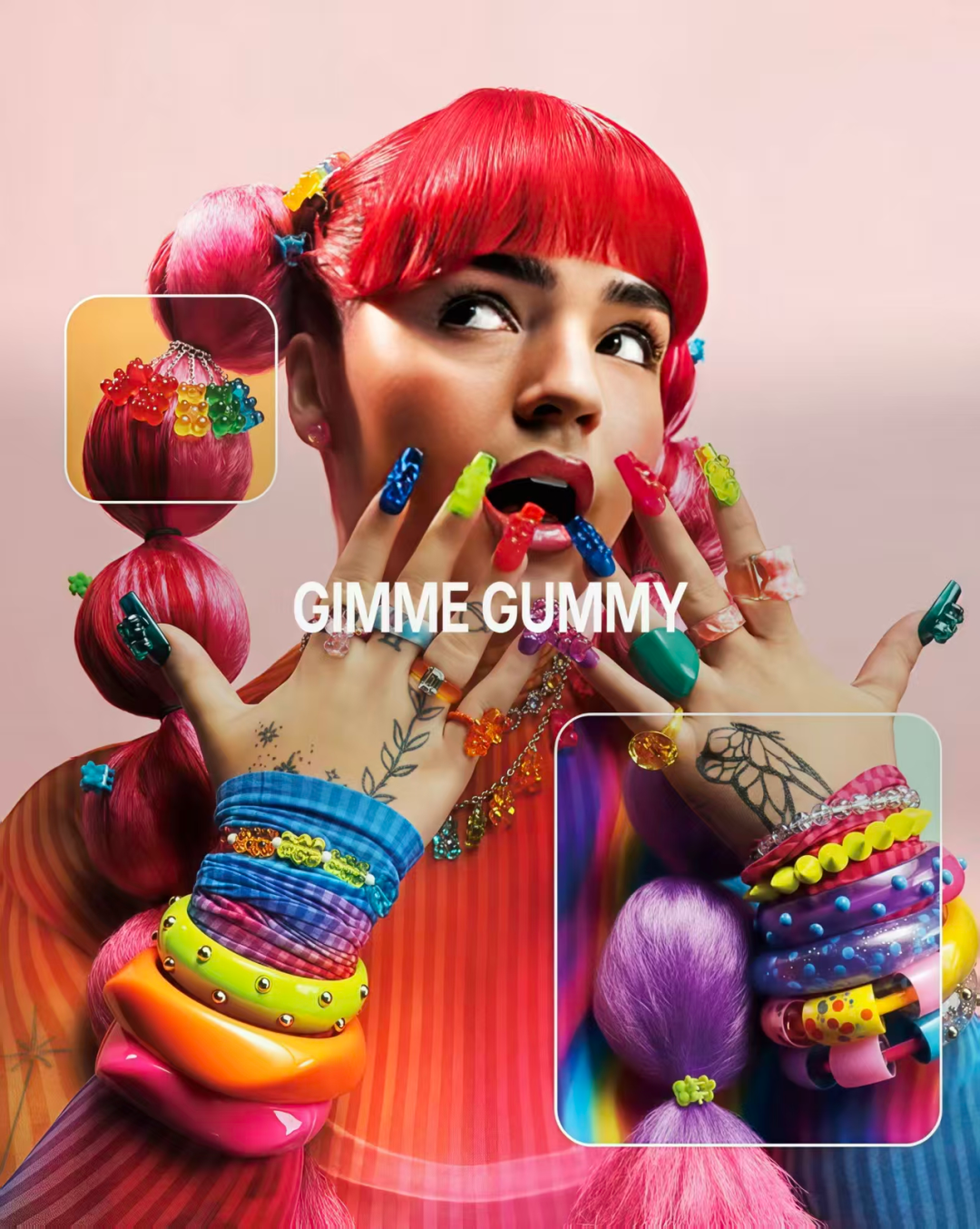 Gimme Gummy是一种“软呼呼、甜滋滋”的治愈系审美,听起来就很可爱。风格上与极繁主义(Maximalism)有些类似,充满亮色(bright colors)、大胆的指甲(crazy nails)和浮夸的配饰(over the top accessories)。