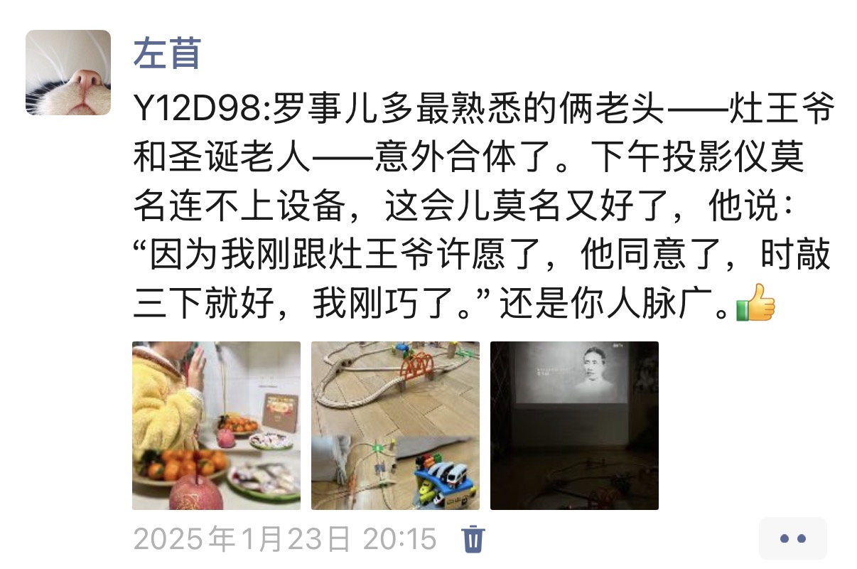 又快过年了,你期待吗?我们很期待在评论区看到你们的过年方式。【来找我们玩】蓬蓬丝(微博@蓬蓬丝)左苜(小红书@左苜)【片尾曲】《HOME》【一些温馨记忆】↑ 蓬蓬丝送给歪歪的枪↑ 事儿多每年除夕的“全家福”↑ 事儿多祭灶的那些日子