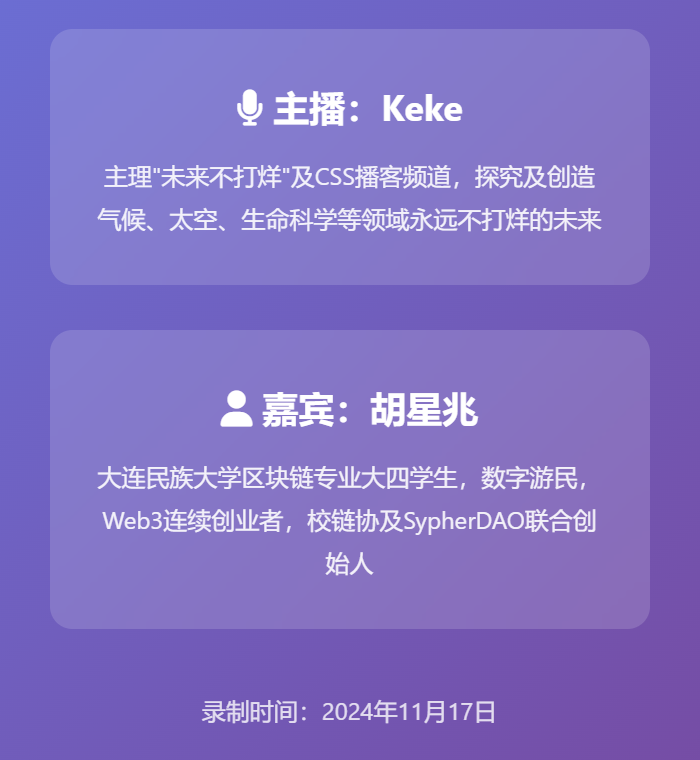 胡星兆 | 大连民族大学区块链专业大四学生,数字游民,Web3 连续创业者。出生于温州,成长于四川小县城,因高考失利与区块链结缘,从大一“卷绩点”到大二为赚钱焦虑,开启 Web3 探索之路。