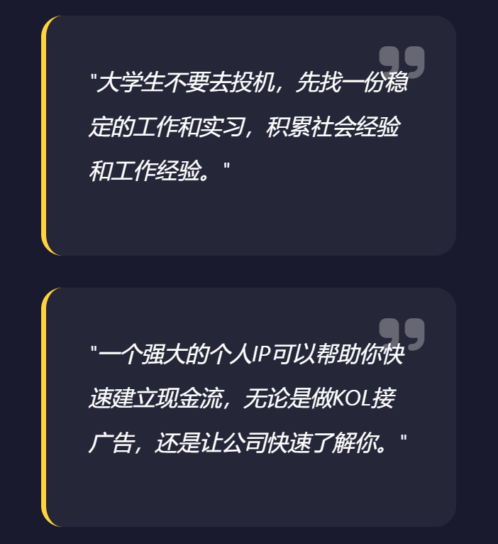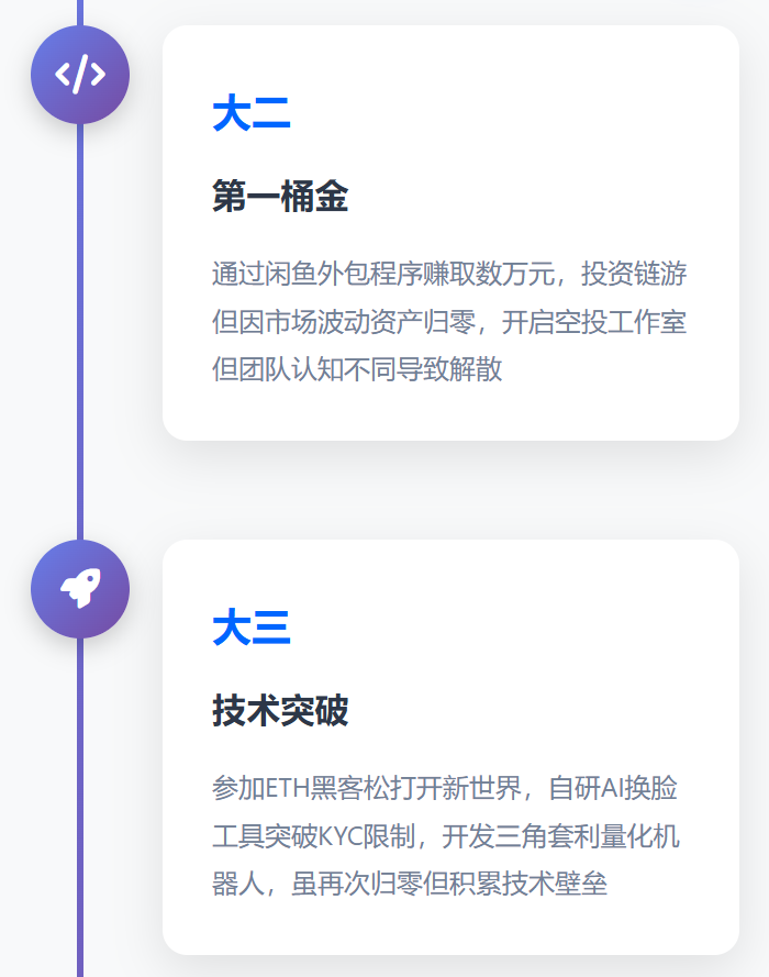 - 早期试错:大二通过外包程序、链游投资赚取第一桶金,后因市场波动资产归零;
