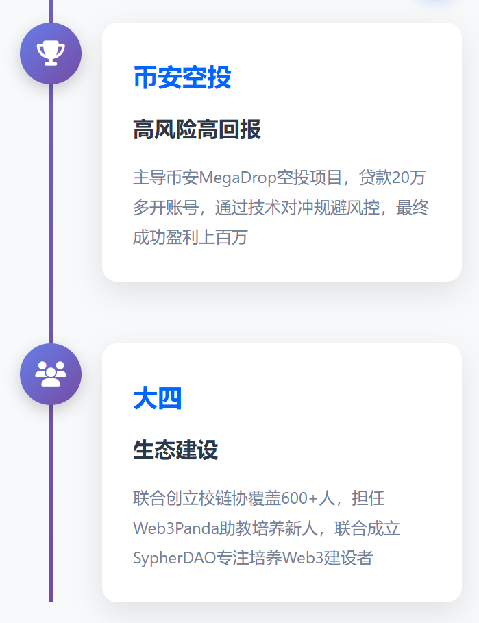 - 生态建设:联合创立校链协,社群覆盖600+人;作为Web3Panda助教培养新人;2024年联合成立SypherDAO,专注培养Web3建设者;
