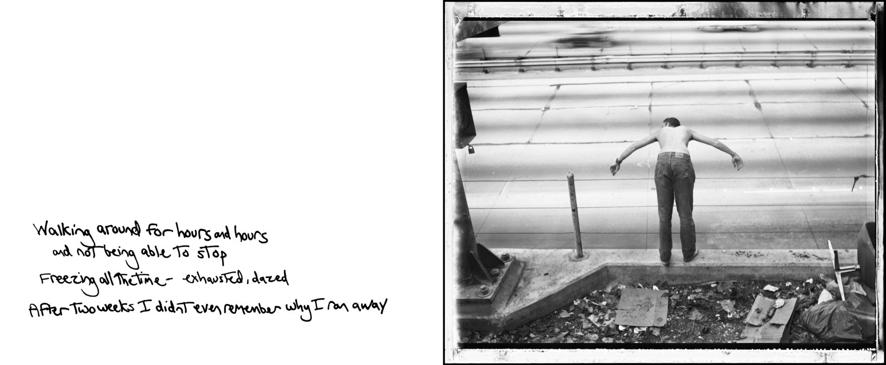 “那是在1987年的旧金山。一群孩子住在里维埃拉旅馆里——是一些卖淫的男孩和他们的金主。其中一个男孩,叫坦克,他向我们展示了他的枪。他说:‘没上膛。’接着他把枪指向自己的头,又指向窗外,然后指向天花板。就在他把枪对准天花板时,他扣动了扳机——枪响了。结果那枪其实是上了膛的。”