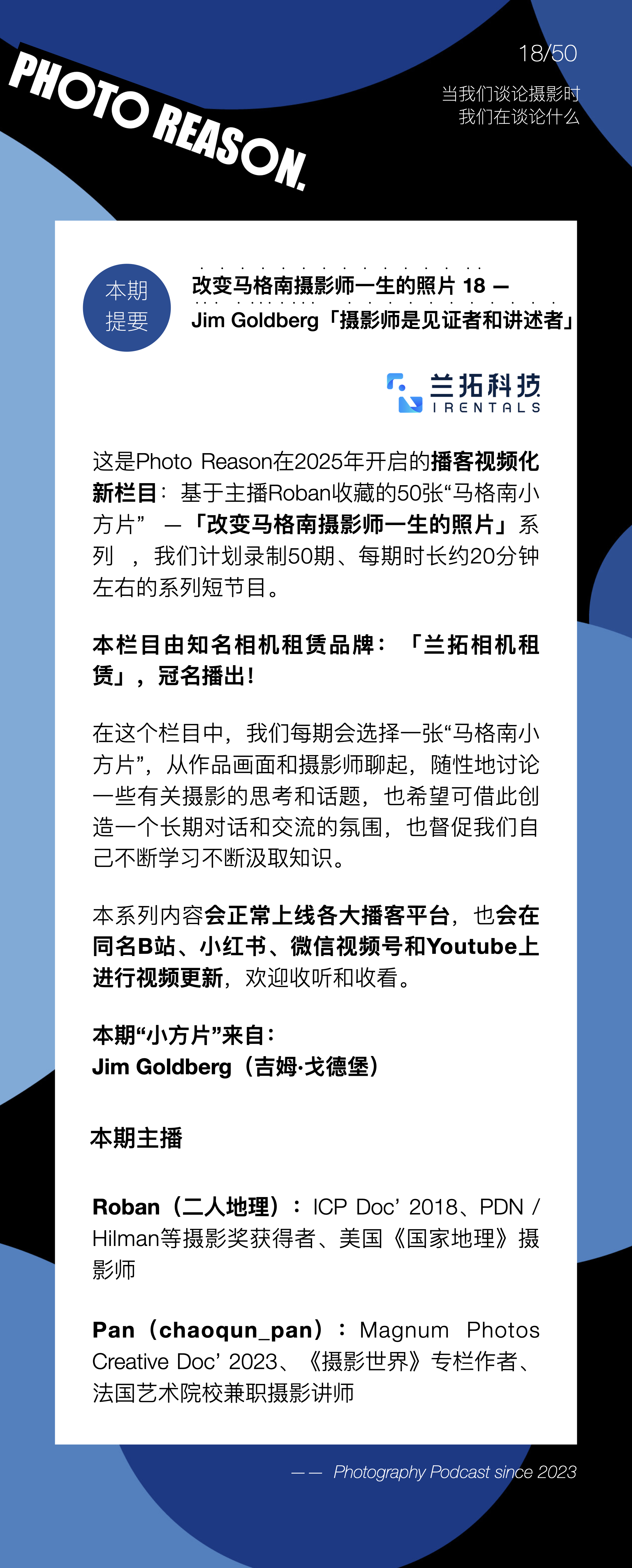 本栏目由知名相机租赁品牌 — 「兰拓相机租赁」冠名播出。作为摄影师,我们每个人都用过兰拓,只做摄影相关器材租赁和服务的兰拓,希望“用摄影点亮十亿人的生活”。