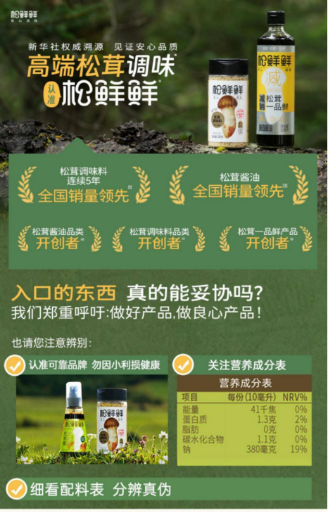 自2020年创立以来,松鲜鲜以家人吃的标准做健康食品,用自然原料,做安心调味让每个家庭吃得健康、安心。全线产品生产过程不额外添加化学提鲜剂、不添加白砂糖和多余添加剂,坚持减钠、控糖、成分自然的健康理念。作为松茸调味料品类开创者,品类主要涵盖松茸调味料、酱油、蚝油、复合调味汁四大类,为中国家庭提供健康且好吃的减钠调味解决方案。