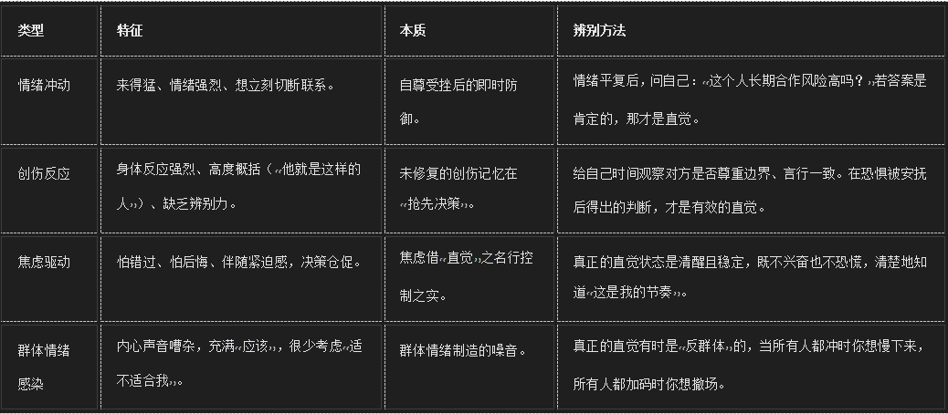 核心:成熟的直觉是价值系统在发声。长期违背直觉,会导致能量消耗、决策成本增高。