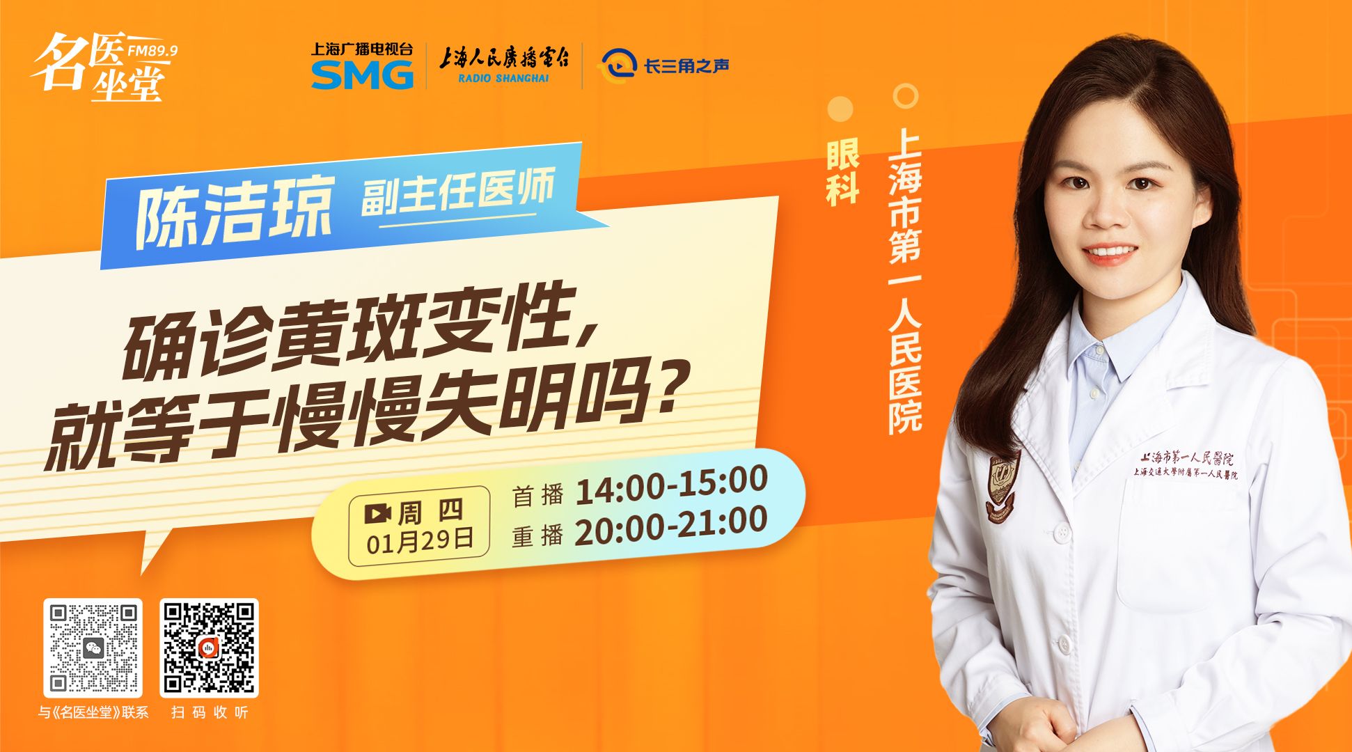 本期节目,为您邀请到上海市第一人民医院眼科 陈洁琼 副主任医师,和您聊聊“确诊黄斑变性,就等于慢慢失明吗?”。