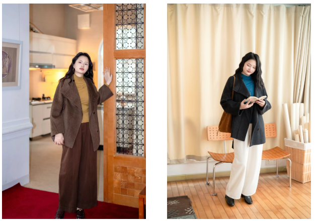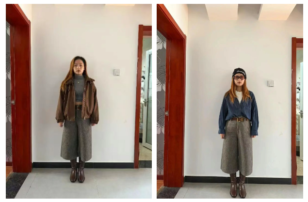 她用毛呢七分裤搭的这两套