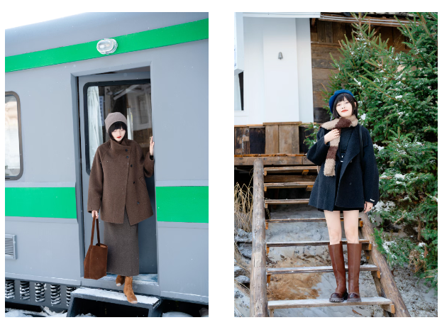 与大衣形成同色系的深浅过渡