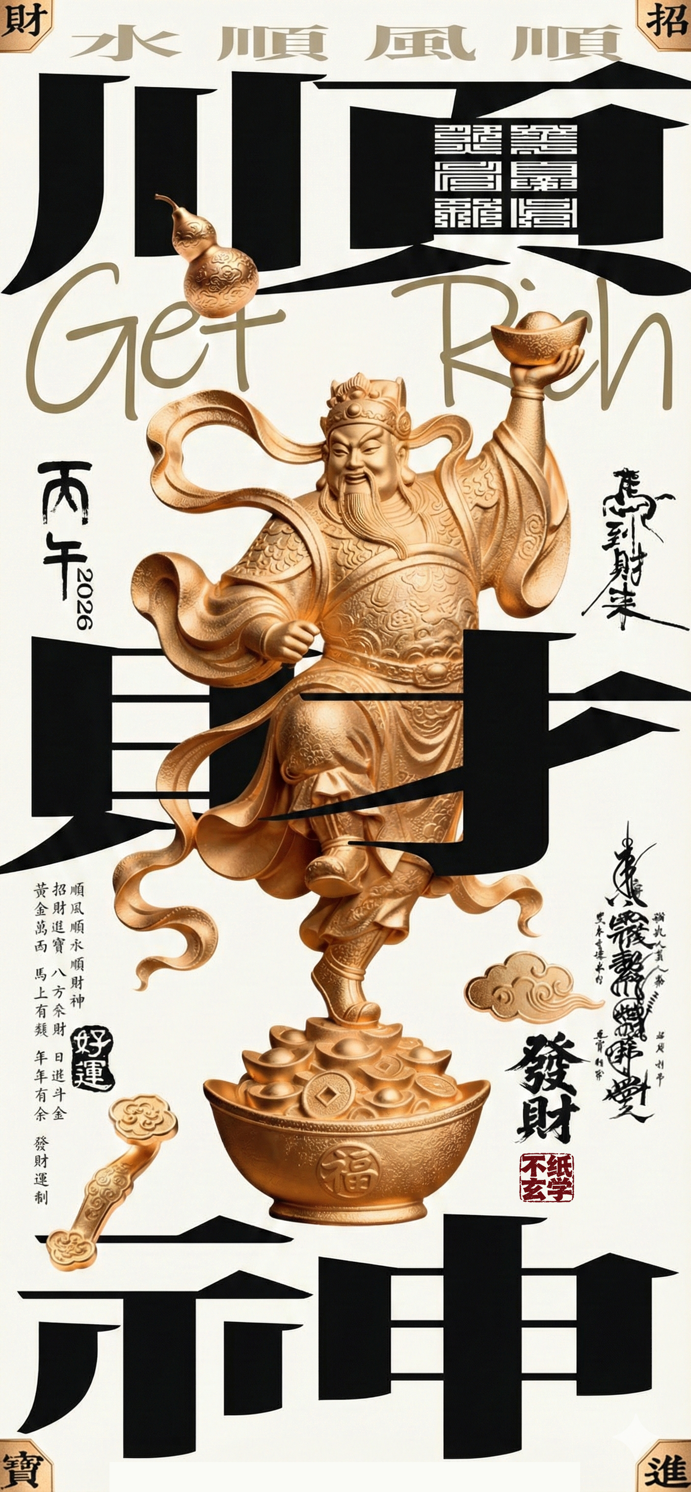 丙午之年,天运流转。 今有玄符,承道家正法,绘「顺财神」真形,纳水木之德,聚八荒金气。 置之屏上,则如请神入宅,镇守财库,开源引泉,晦气消散。 愿君日观此符,心诚气顺,则财源如活水,涓涓不息,终成江海。