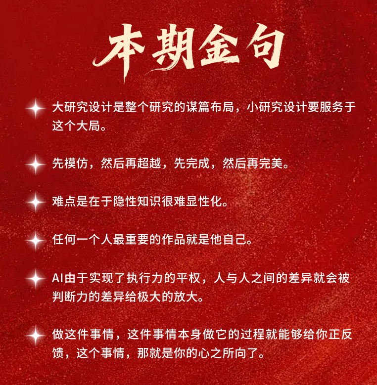从研究设计的广义与狭义辨析(大设计定全局,小设计服大局),到ABC选题模型拆解 “好选题的核心密码”;从隐性知识的获取难点,到审稿人视角下的研究价值判断;