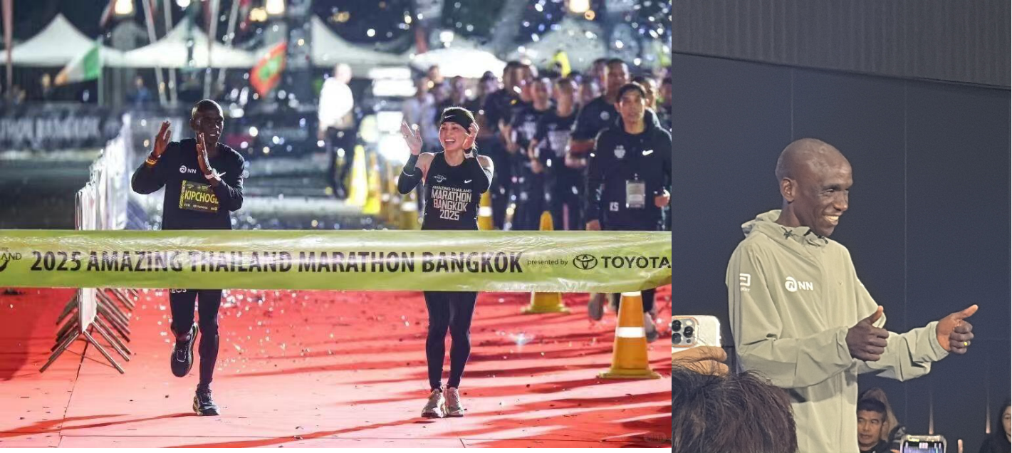 1、泰国王后和基普乔格一共抵达终点,总用时2小时13分40秒;杀老师实拍基普乔格