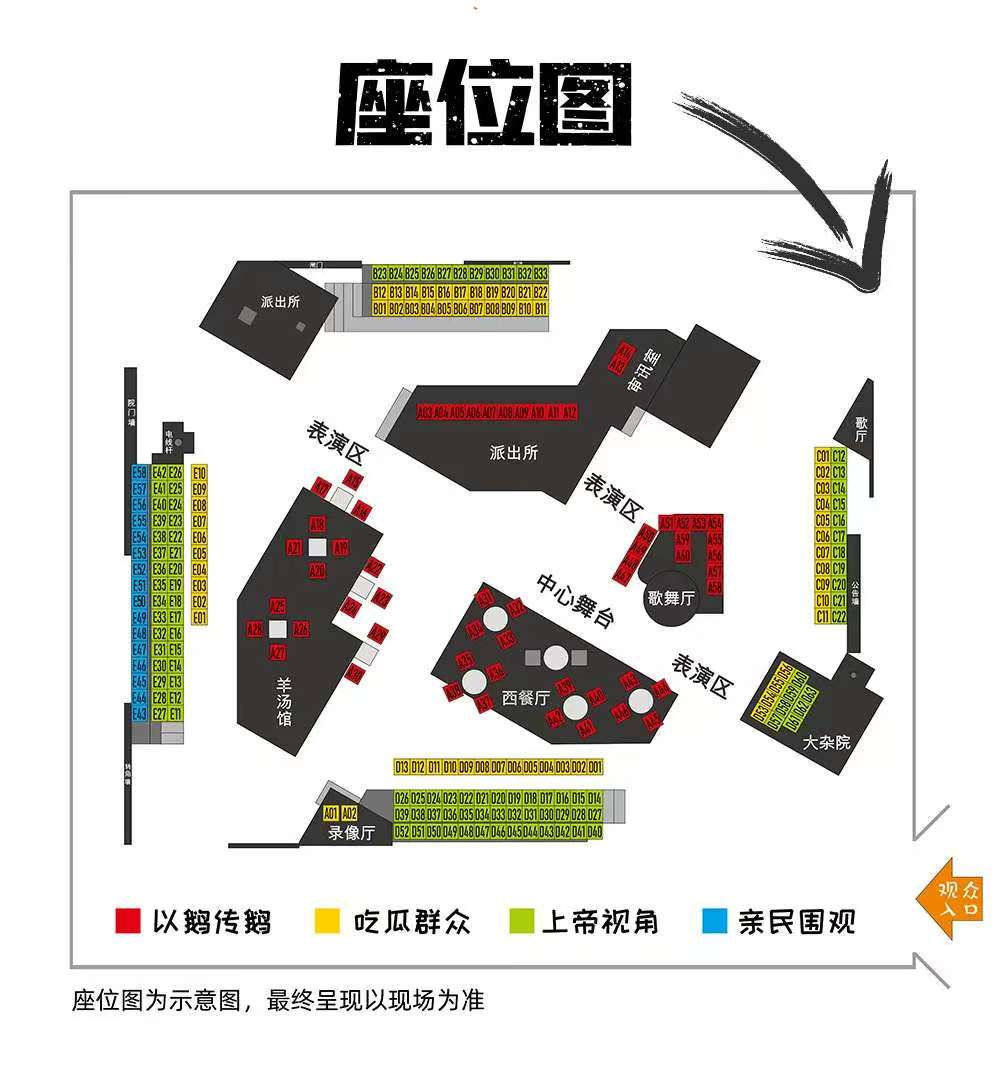 作为全景沉浸互动剧场,《大真探赵赶鹅》设定了"以鹅传鹅"、"吃瓜群众"、"上帝视角"三档票价,将演绎空间分布为五大区域供观众选择。其中,社牛专属的"以鹅传鹅"区呈现多点互动:在羊汤馆近距离观测胡同百态人生,在派出所加个班开会分析案情进展,来西餐厅享受浪漫下午茶惊喜邂逅,逛歌舞厅做全场最燃最嗨气氛组,甚至可以到录像厅体验最独特视觉,发掘隐秘角落。如果只想做"吃瓜群众""胡同看客",那也可以充当南槐树街坊们,坐在大杂院的竹凳子、木板凳上唠家长里短,佛系吃瓜。还可以解锁"审讯室""第一排"这样的零距离无压力专属坐席,第一视角看戏。如果只想安静看戏,不参与互动,也请放心大胆走进大鹅的沉浸空间,选择"上帝视角"区域,冷眼旁观纵览全程,为精彩演出贡献欢笑与掌声。