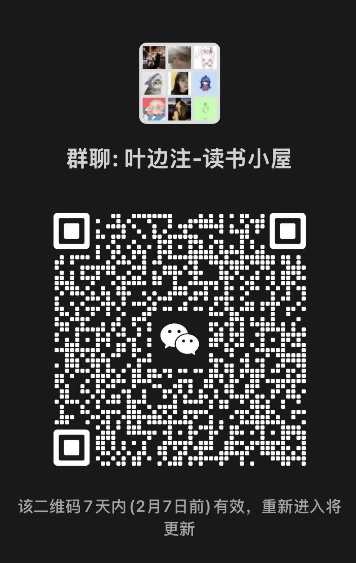 叶边注 读书小屋微信群 开张啦 🎆🧨🎉之后我们会在群里提前公布接下来的读书计划,希望慢慢把这里变成一个大家能一起陪伴式阅读的围炉读书会。