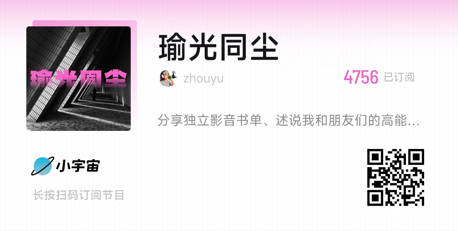 如果你喜欢本期节目的嘉宾Zhou yu,对她的播客《瑜光同尘》有兴趣,那就订阅并收听起来吧!在她轻柔的声线和自然的表达中,收获平静吧!