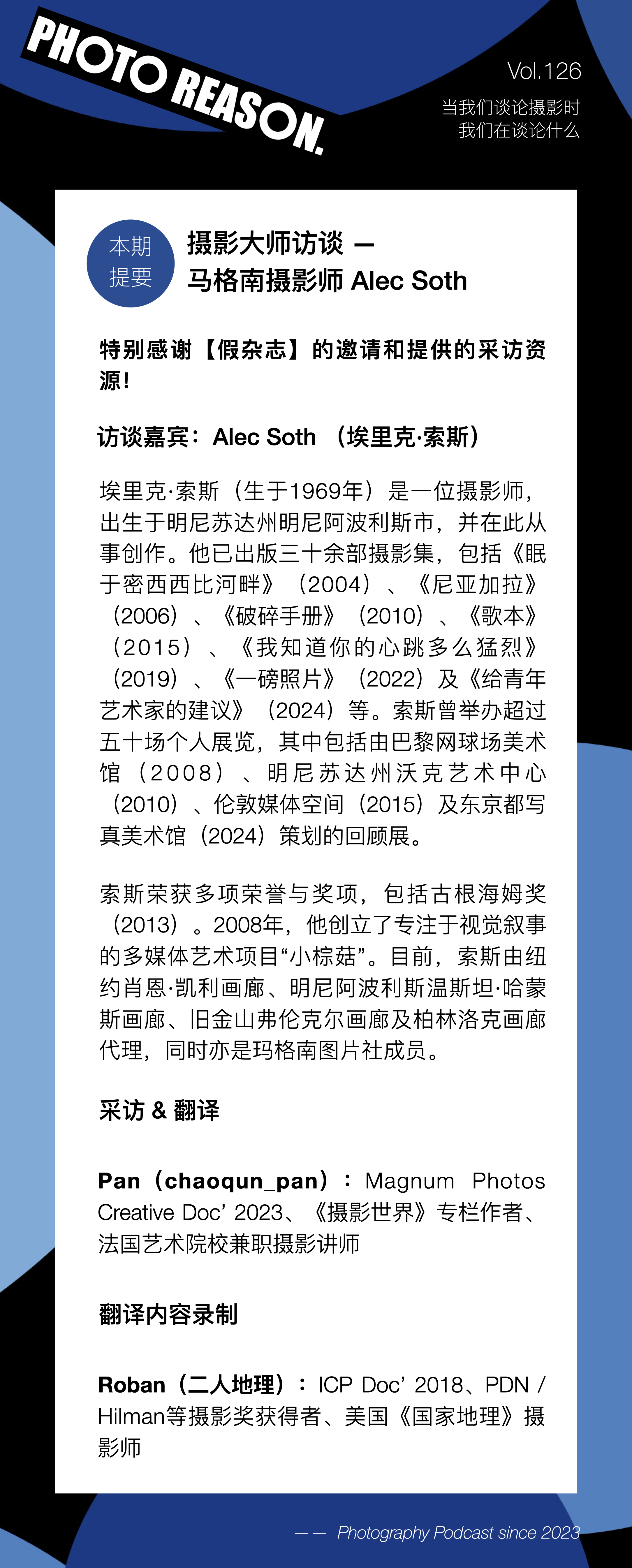 本期访谈节目由【Photo Reason】和【接触印相】共同进行。节目的前半部分,Photo Reason主播Pan和接触印相主播吴晓隆就大家都好奇的问题共同采访了Alec Soth。