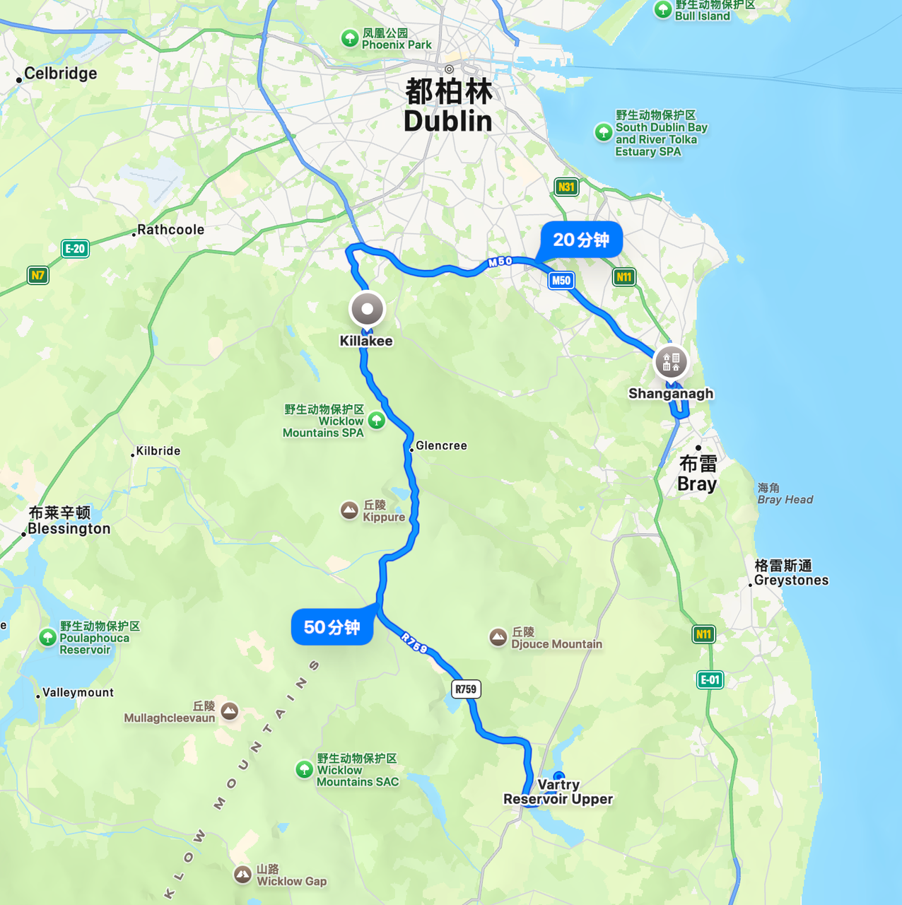 瓦特里水库(Vartry Reservoir Upper)、基拉基(Killakee)和尚加纳(Shanganagh)三个地区之间的距离示意图