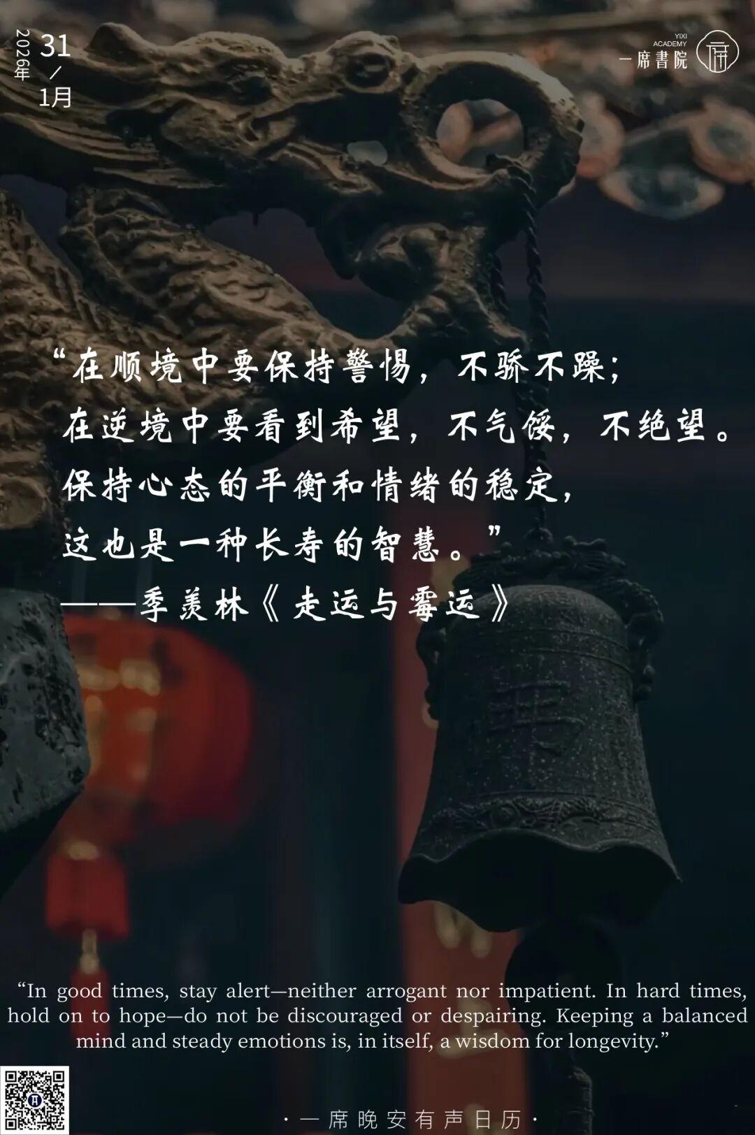 “In good times, stay alert—neither arrogant nor impatient. In hard times, hold on to hope—do not be discouraged or despairing. Keeping a balanced mind and steady emotions is, in itself, a wisdom for longevity.”