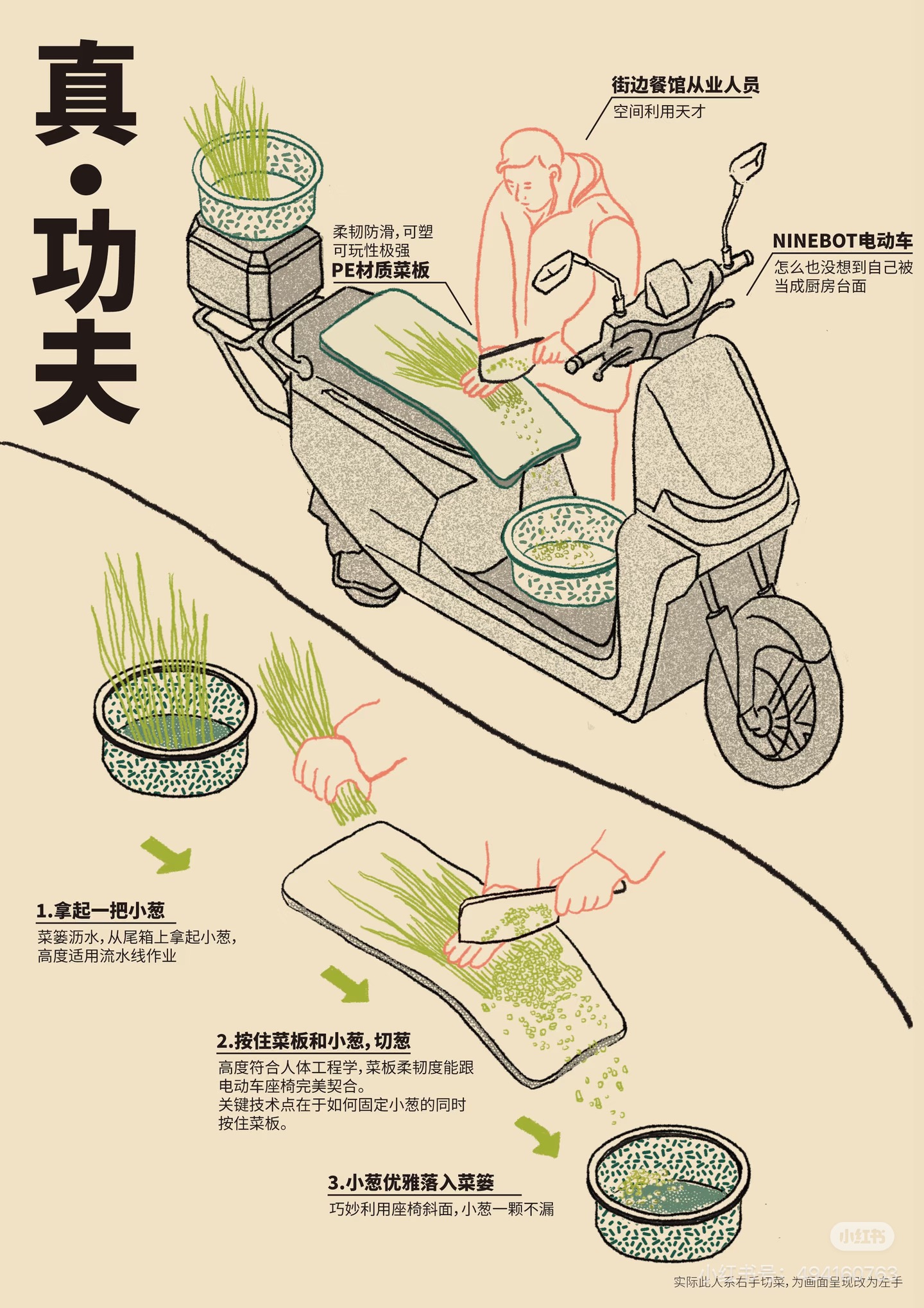 记录一位大哥利用电动车车座切葱的潇洒瞬间,并图解可视化了利用“后座菜兜”到“脚踏板菜篮”高差顺序的完整切葱流水线的“智慧”。