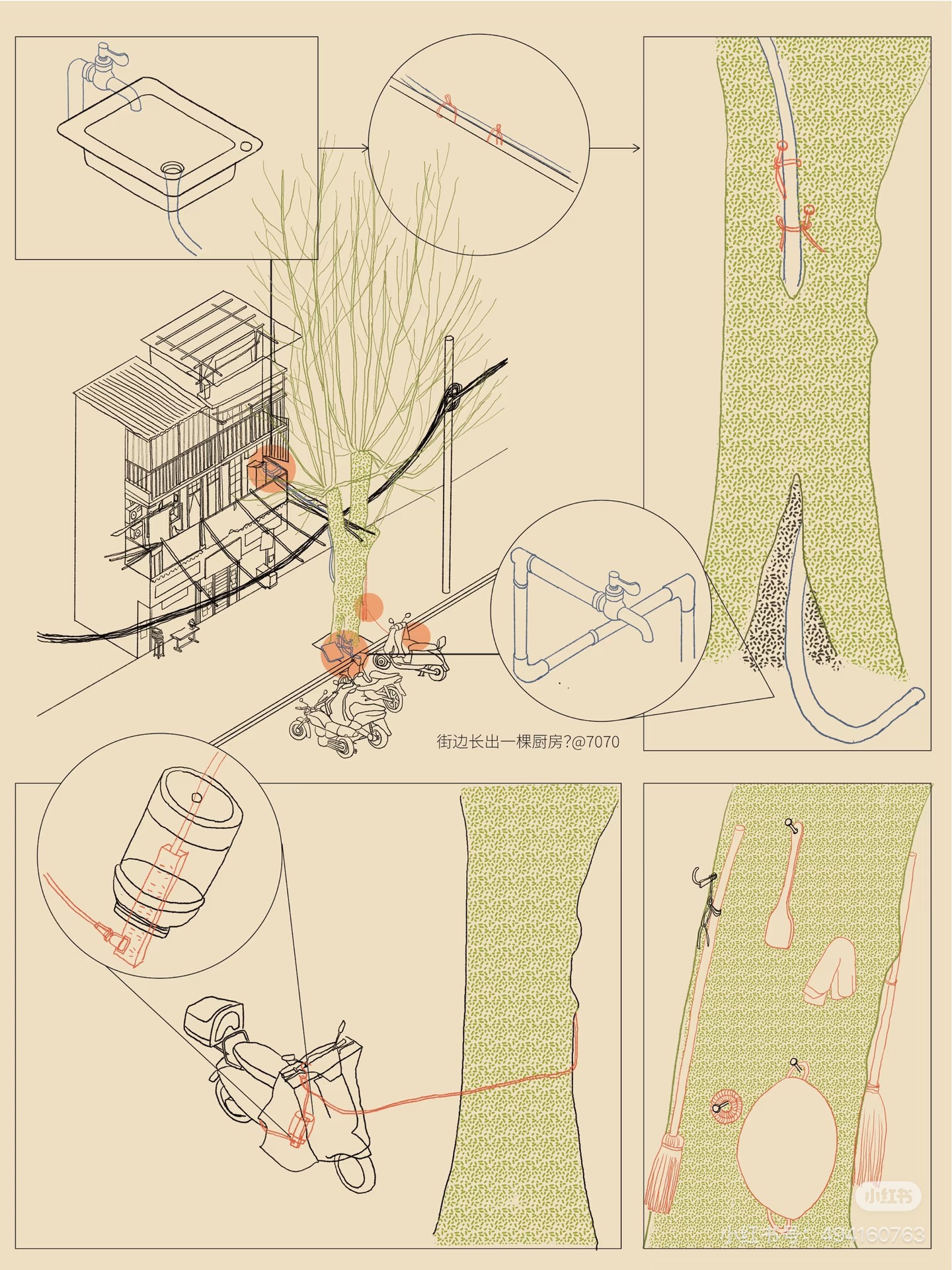 以下是 70 在节目中提到的街头观察记录。这些手绘图解,记录了她在散步过程中偶遇的“日常惊奇”,也构成了一份关于城市缝隙的“生活战术”档案。(以下所有图源©7070)