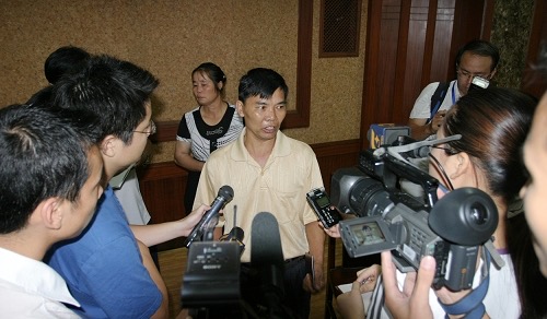 图为覃父接受媒体采访