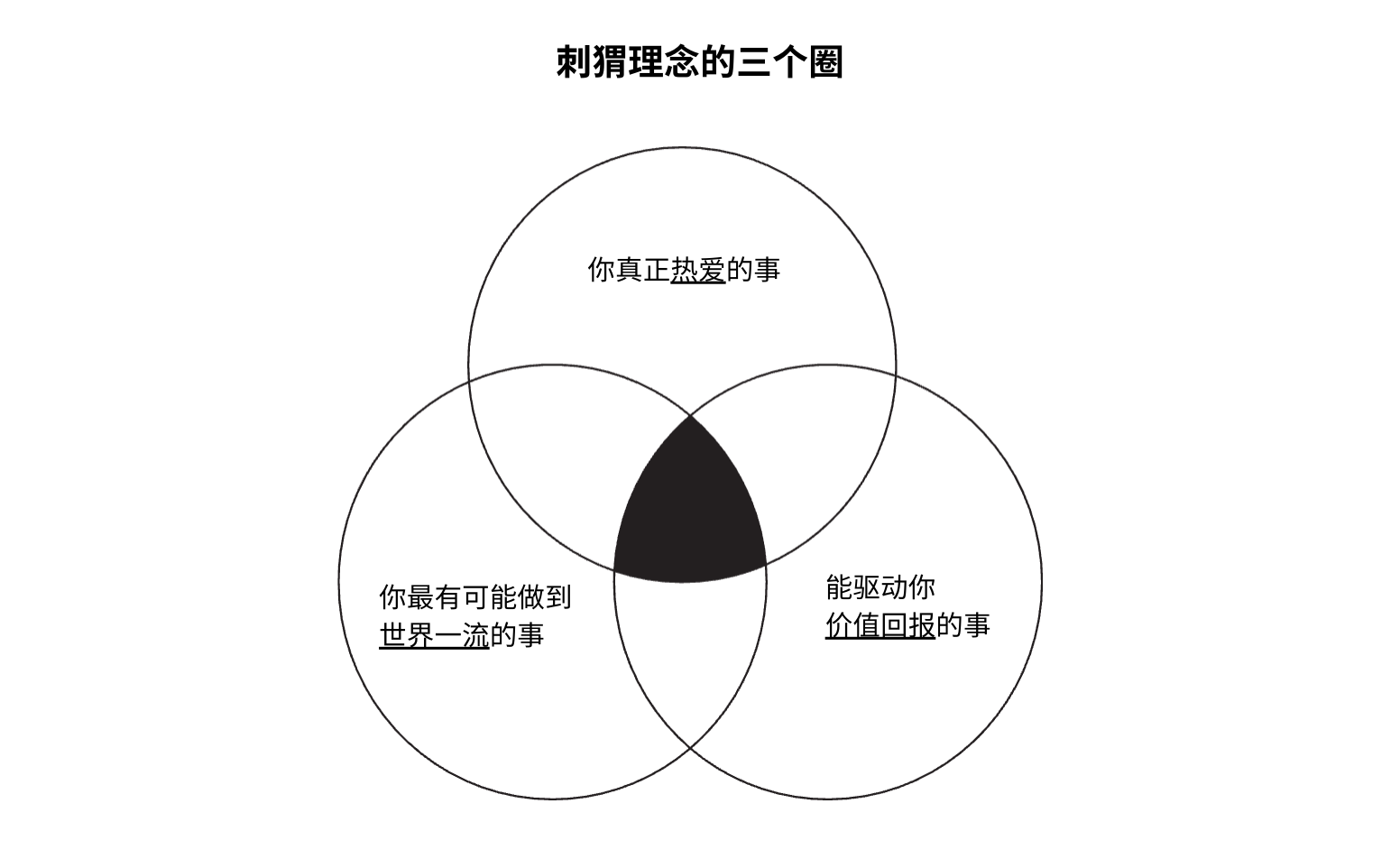 Jim Collins(詹姆斯·柯林斯)由此比喻,要真正实现卓越,就需要找到以下三个维度的交集,并且持续围绕这个交集做决策和行动。
