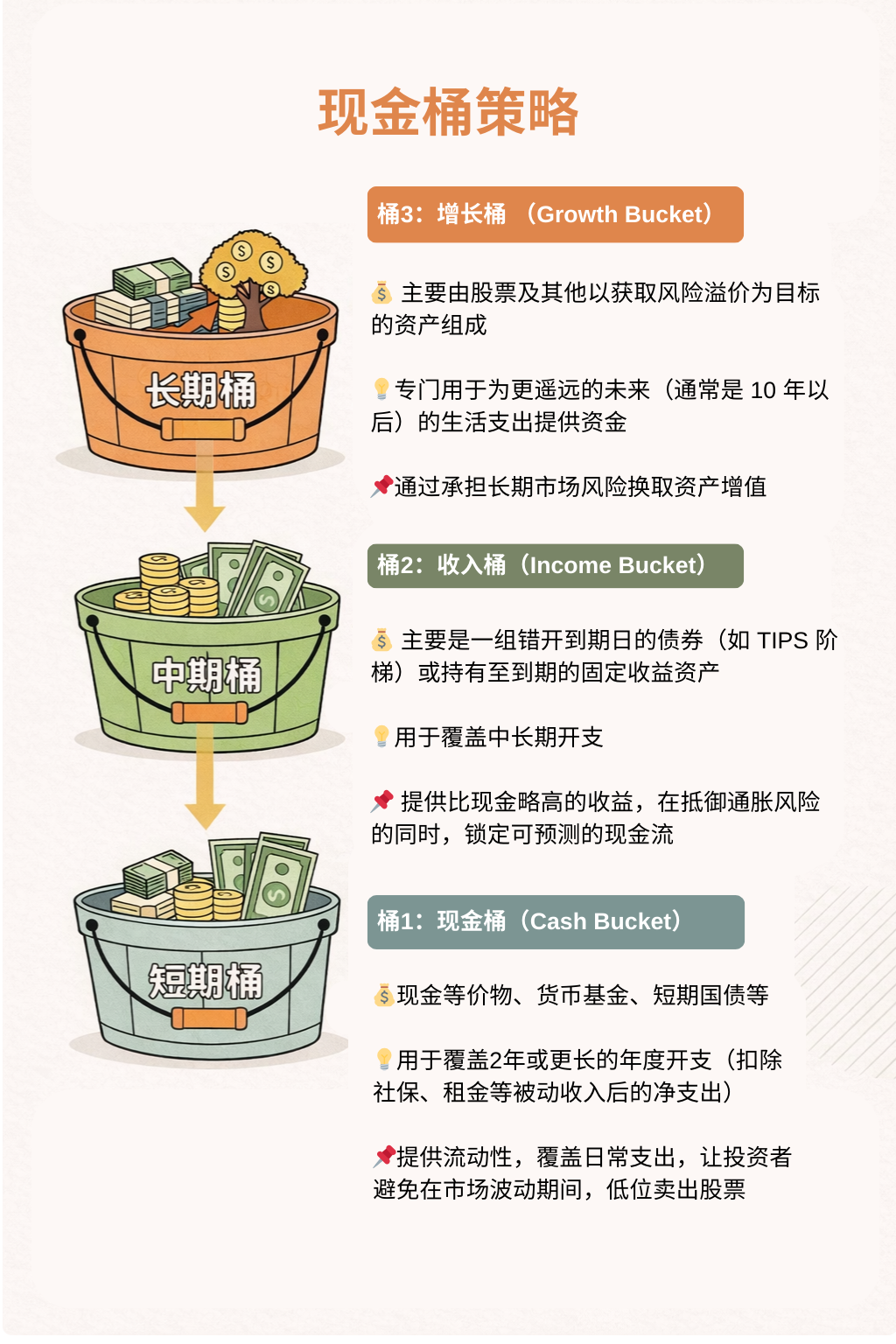 - 动态管理现金桶:有序消耗: 退休者优先支出短期桶中到期的债券或现金储备。