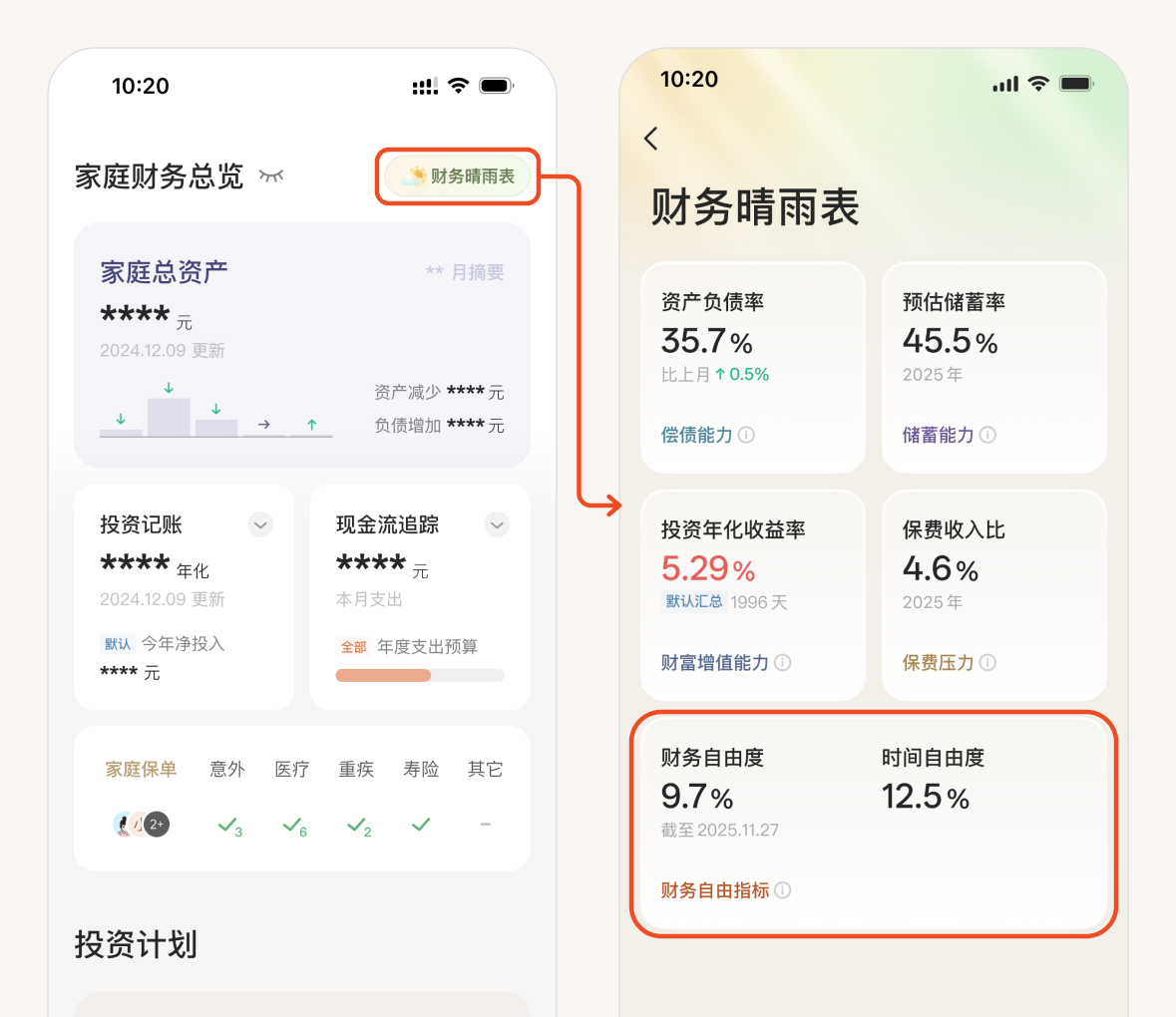 在有知有行的财务晴雨表中,展示了两个衡量财务自由指标的数据——财务自由度和时间自由度。
