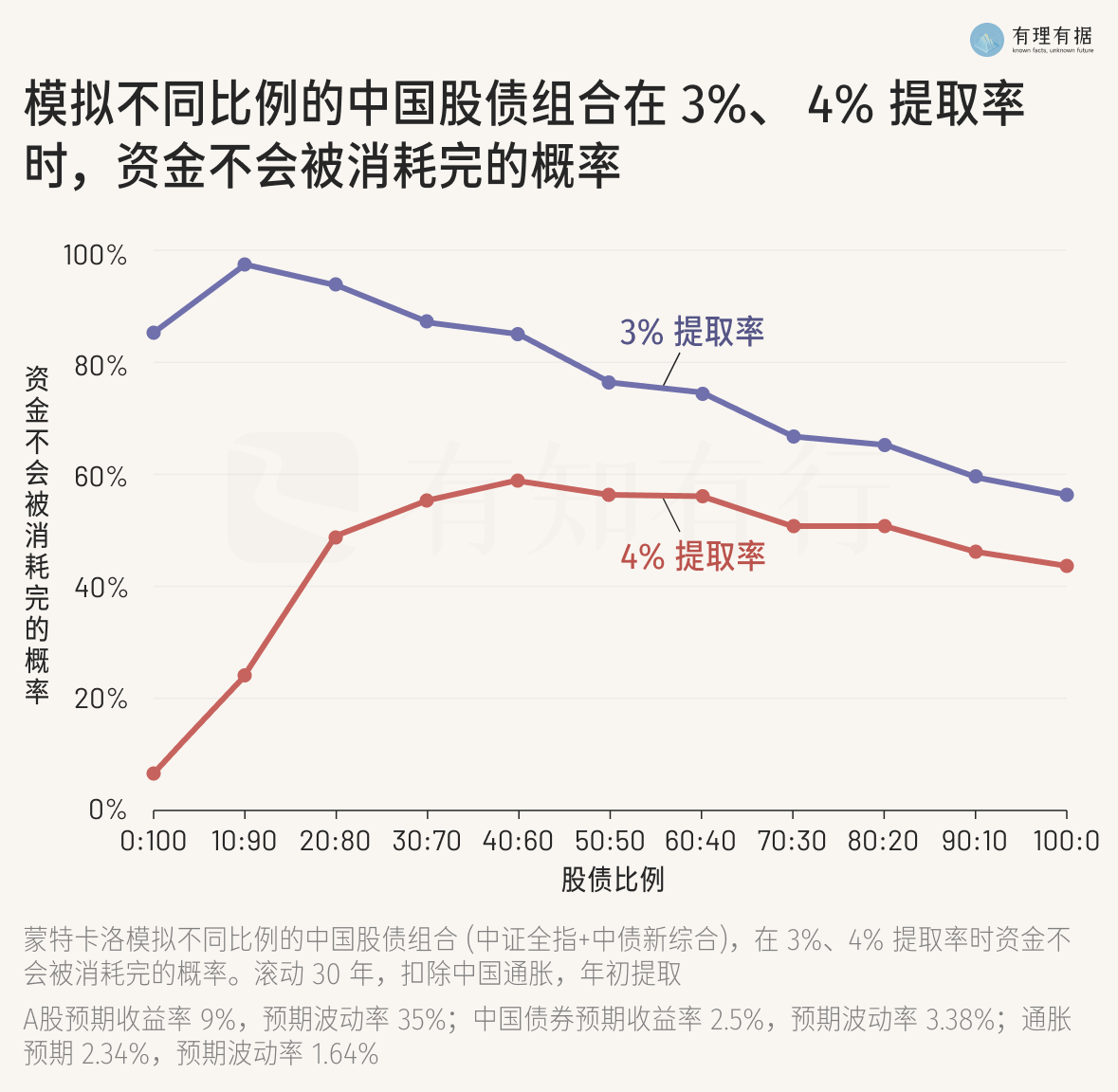 - 每一年都需要从投资收益中提取固定金额用于支出,中国市场的波动比美股更大,具有「熊长牛短」的特点。如果退休初期遭遇长熊市,3% 的低提取率能有效减少本金损耗。
