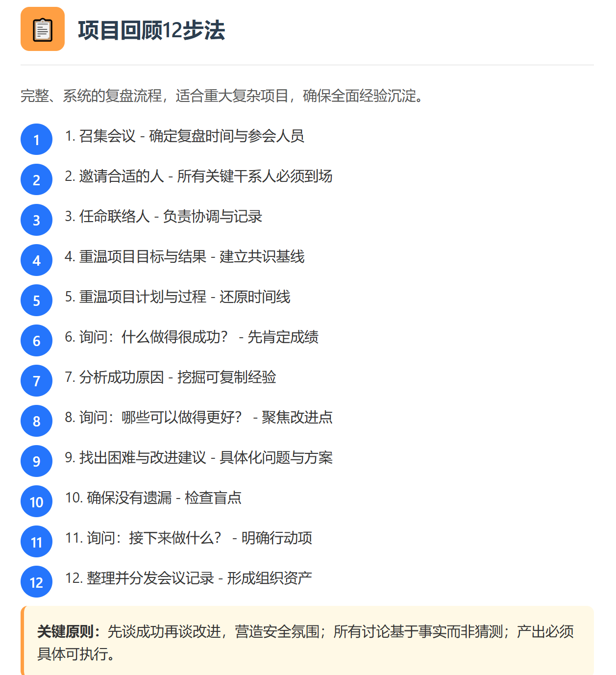 ◦ 项目回顾12步法:为重大战役举行庄严的“智慧封存”仪式,确保经验不流失。