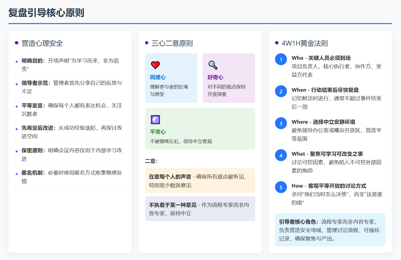 • 引导核心:营造心理安全、三心二意、4W1H黄金法则