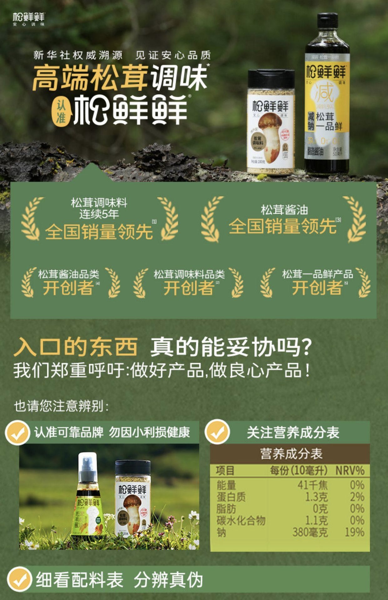 小羊喜欢的——松鲜鲜松茸调味料:【一瓶可顶替味精/鸡精+盐】代替传统盐+鸡精、味精的烹饪方式,从源头控制总钠摄入!国际清洁标签认证,鲜味来自松茸、多重果蔬和自然发酵食材,不想水肿的救星!