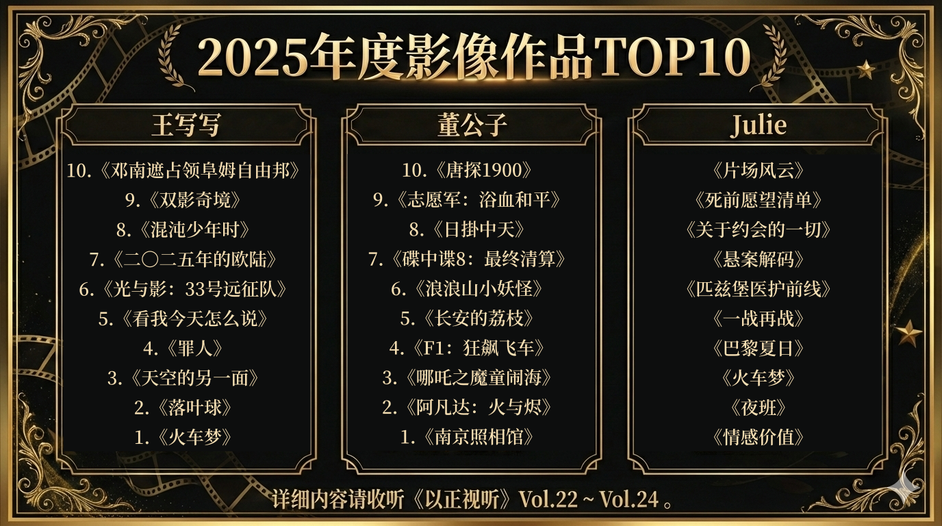 2025年度总结的最后一期,每个人报出了去年最喜爱的电影前三名,以及那些值得关注的影人和一些没进榜单但也想提一下的作品。